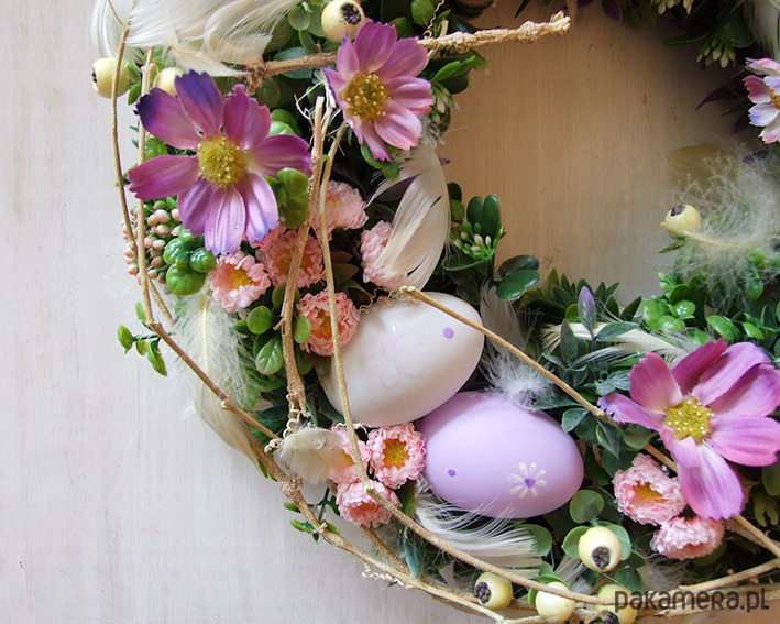 Wesoły, wiosenny wianek. Wykonany z wysokiej jakości sztucznych roślin, wiosennych kwiatów, drobnych gałązek, udekorowany fioletowymi pisankami. Wianek posiada haczyk do zwieszenia, ale równie dobrze prezentuje się położony czy postawiony np na komodzie. W komplecie z pasującą wstążką. Średnica ok 36cm