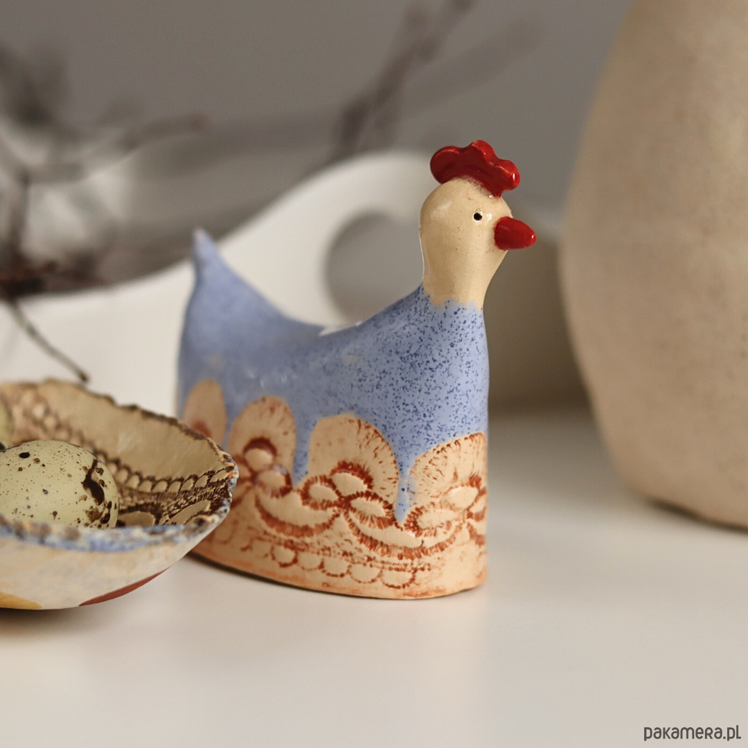 Ręcznie lepiona, bez użycia form ceramiczna kurka wielkanocna z koronką. Wykonana z jasnej gliny, lekka, szkliwiona.