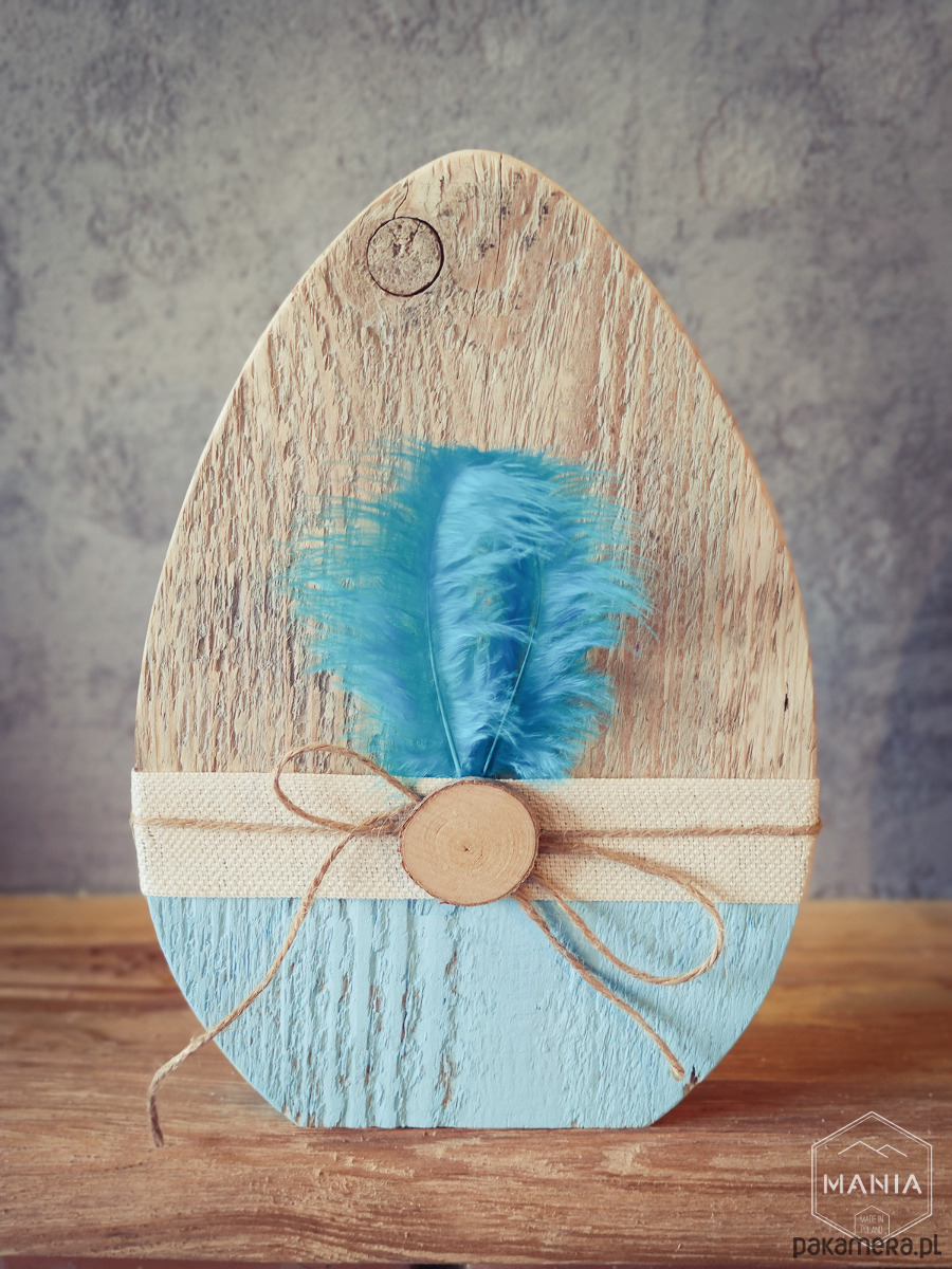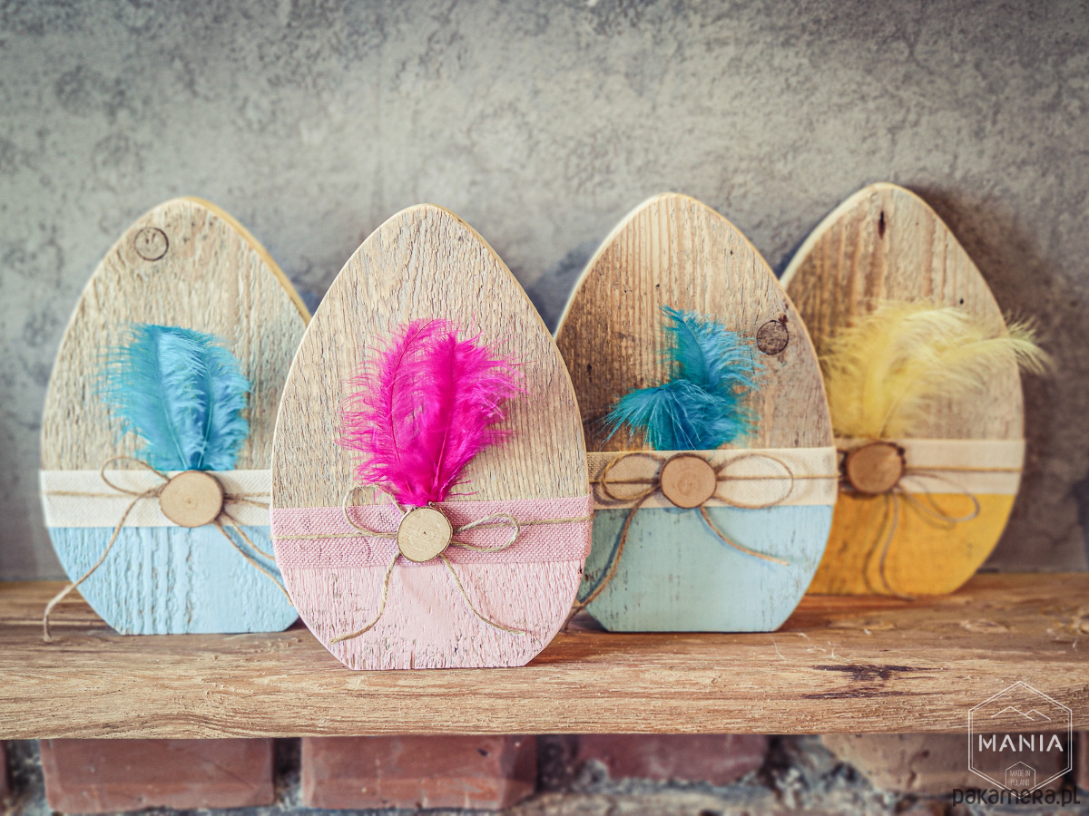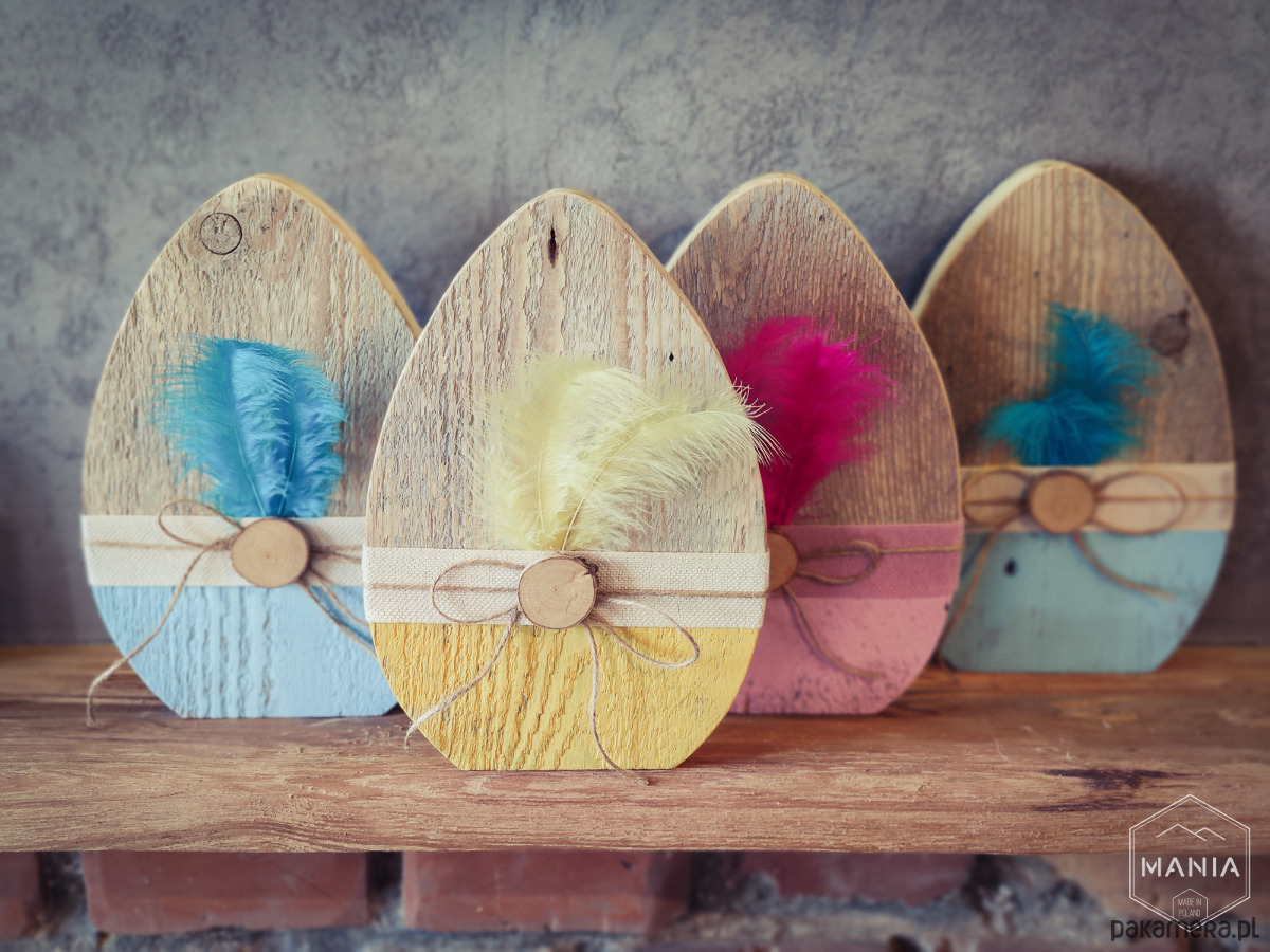 Jajka wycięte zostały ze starej deski, starannie wyszlifowane a następnie wykończone ekologiczną wstążka i piórkami.