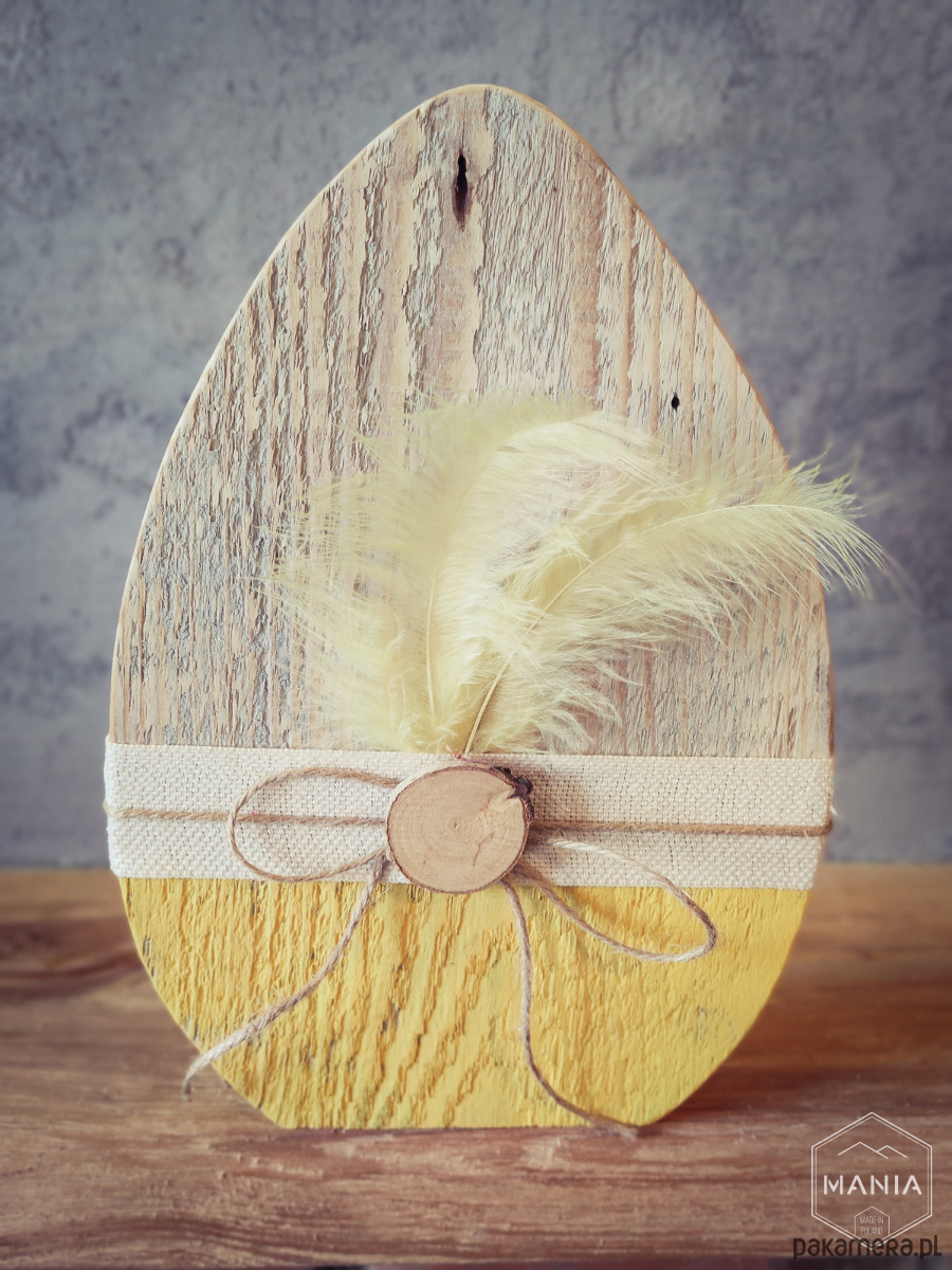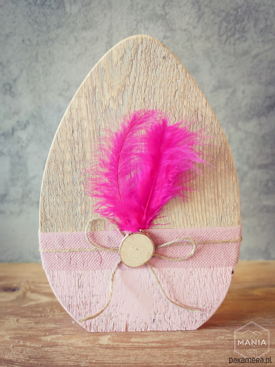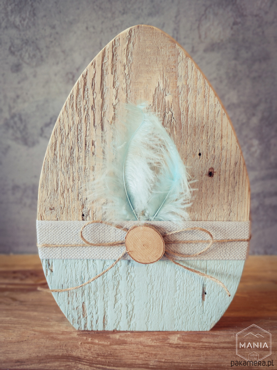 Jajka wycięte zostały ze starej deski, starannie wyszlifowane a następnie wykończone ekologiczną wstążka i piórkami.
