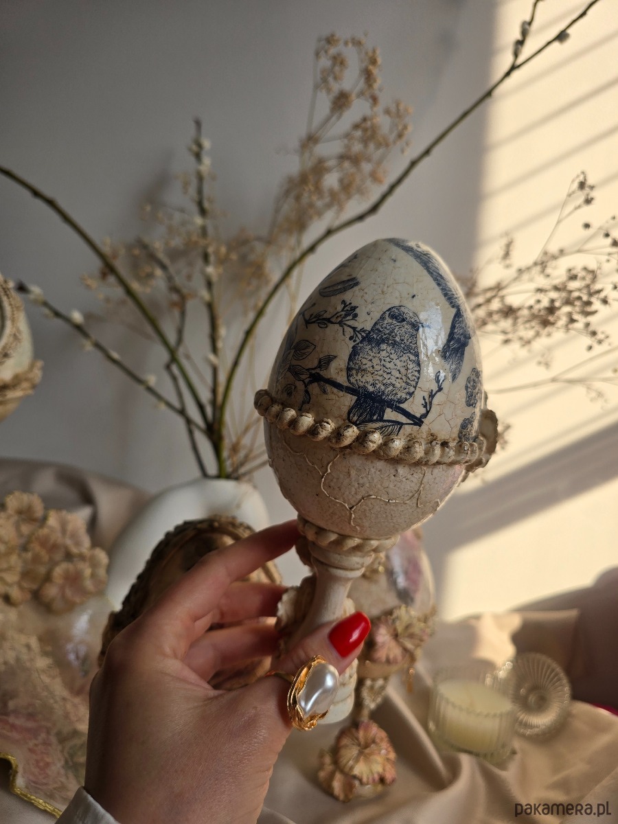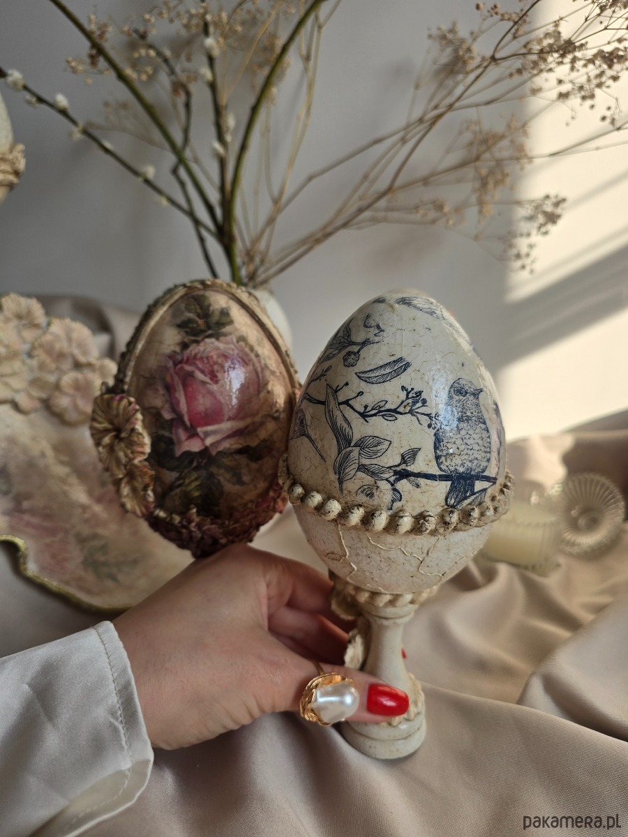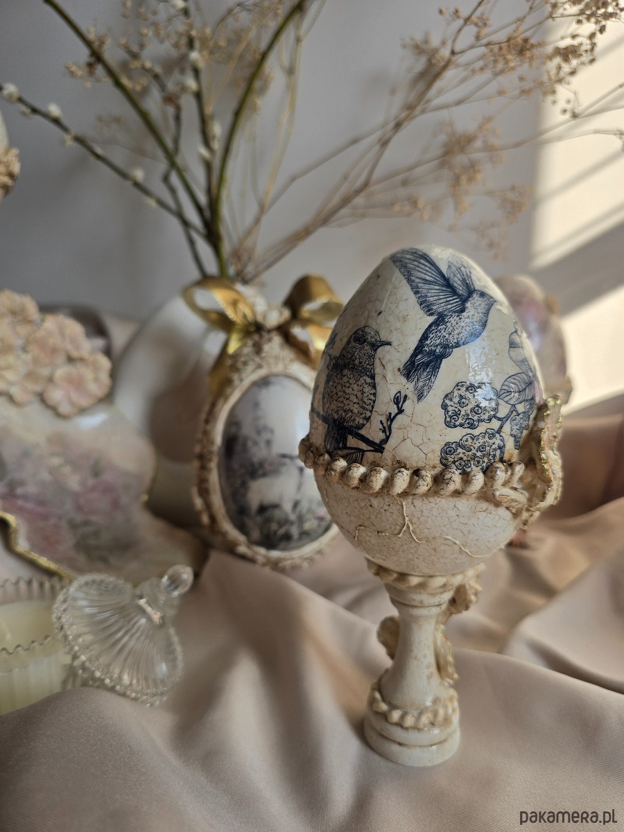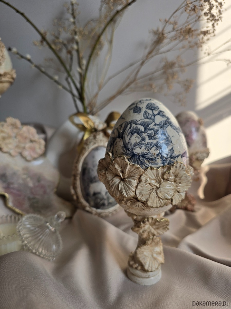 Retro jajko na nóżce zdobione mieszaną techniką, piękna dekoracja Wielkanocnego stołu. Połączenie sztuki decoupage oraz kwiatów 3d i delikatnych spękań tworzy elegancką i spójną całość.