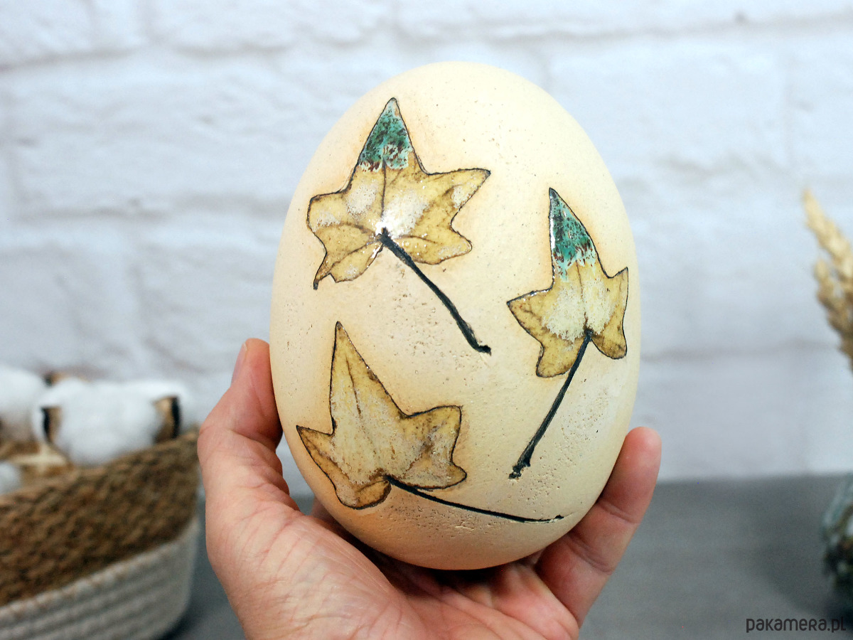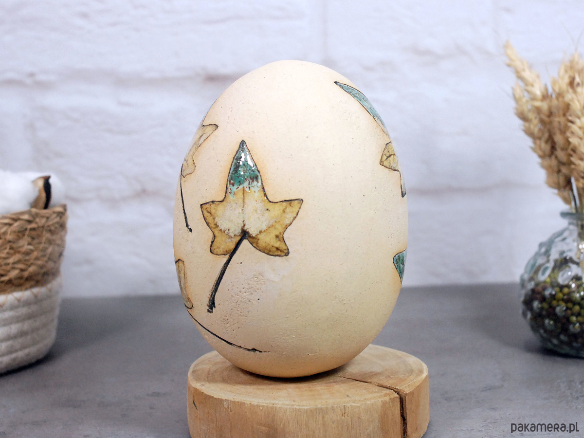 Ręcznie robione, ceramiczne jajo wielkanocne wykonane z naturalnej gliny z ręcznie malowanymi liśćmi. Jajo możesz postawić na stole, komodzie czy w oknie. Idealne zarówno jako element świątecznego wystroju, jak i wyjątkowy prezent dla bliskich.