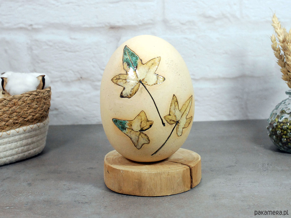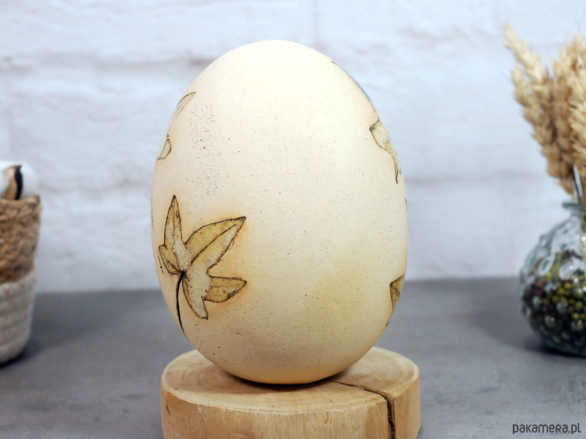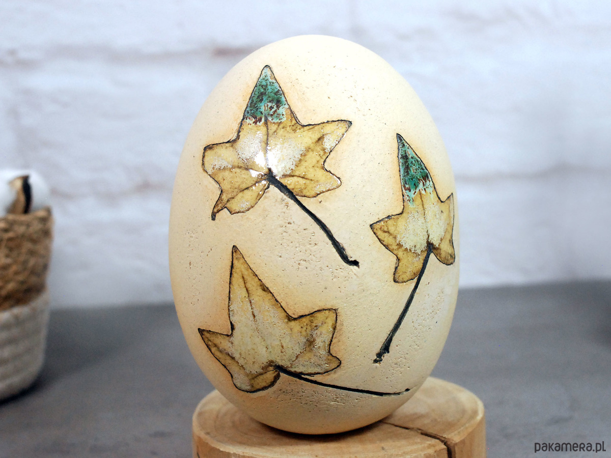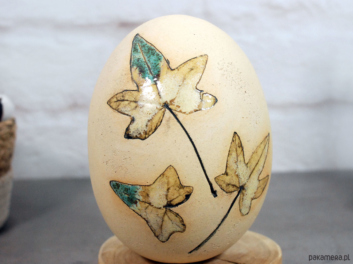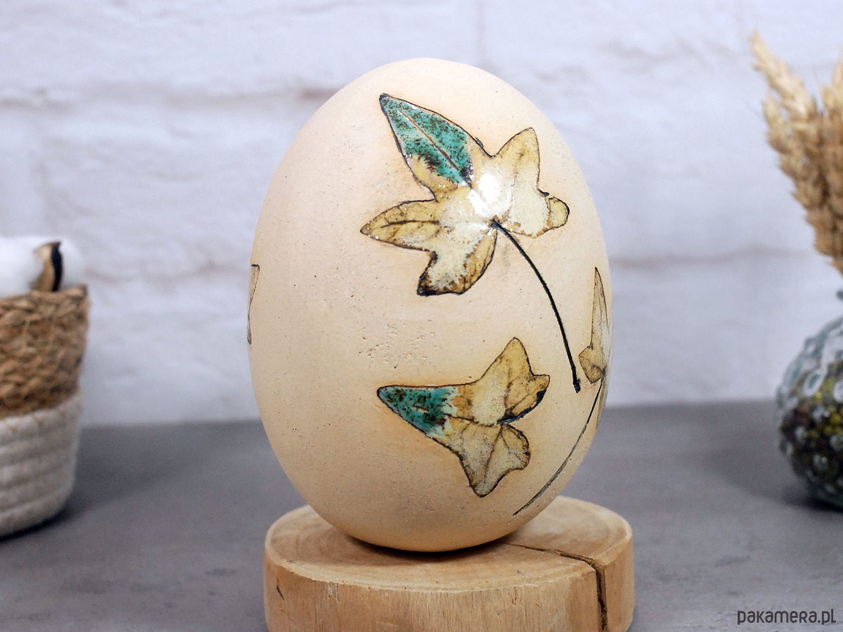 Ręcznie robione, ceramiczne jajo wielkanocne wykonane z naturalnej gliny z ręcznie malowanymi liśćmi. Jajo możesz postawić na stole, komodzie czy w oknie. Idealne zarówno jako element świątecznego wystroju, jak i wyjątkowy prezent dla bliskich.