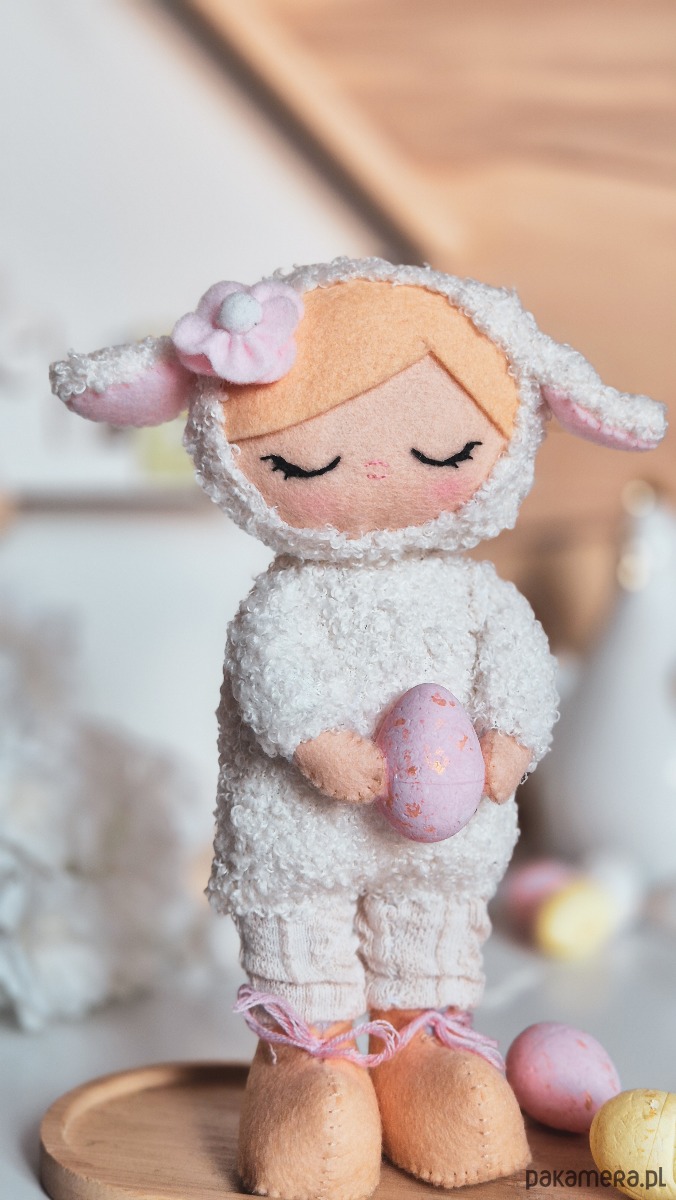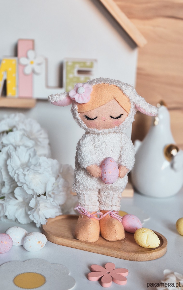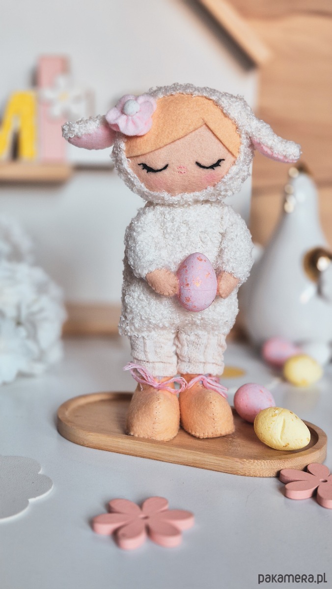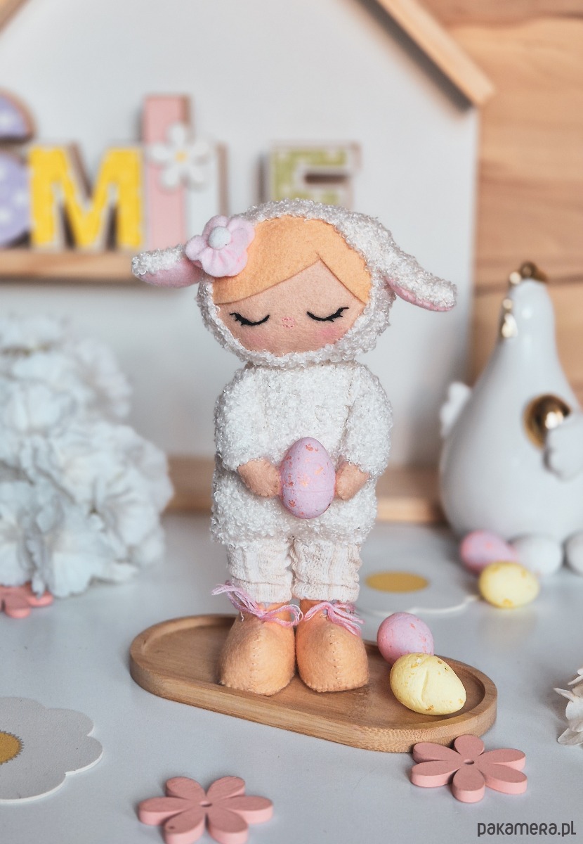 Filcowa laleczka, dziewczynka w stroju wielkanocnego baranka. Oryginalna dekoracja uszyta tylko w jednym egzemplarzu.