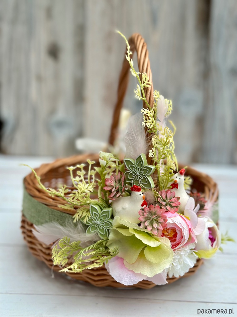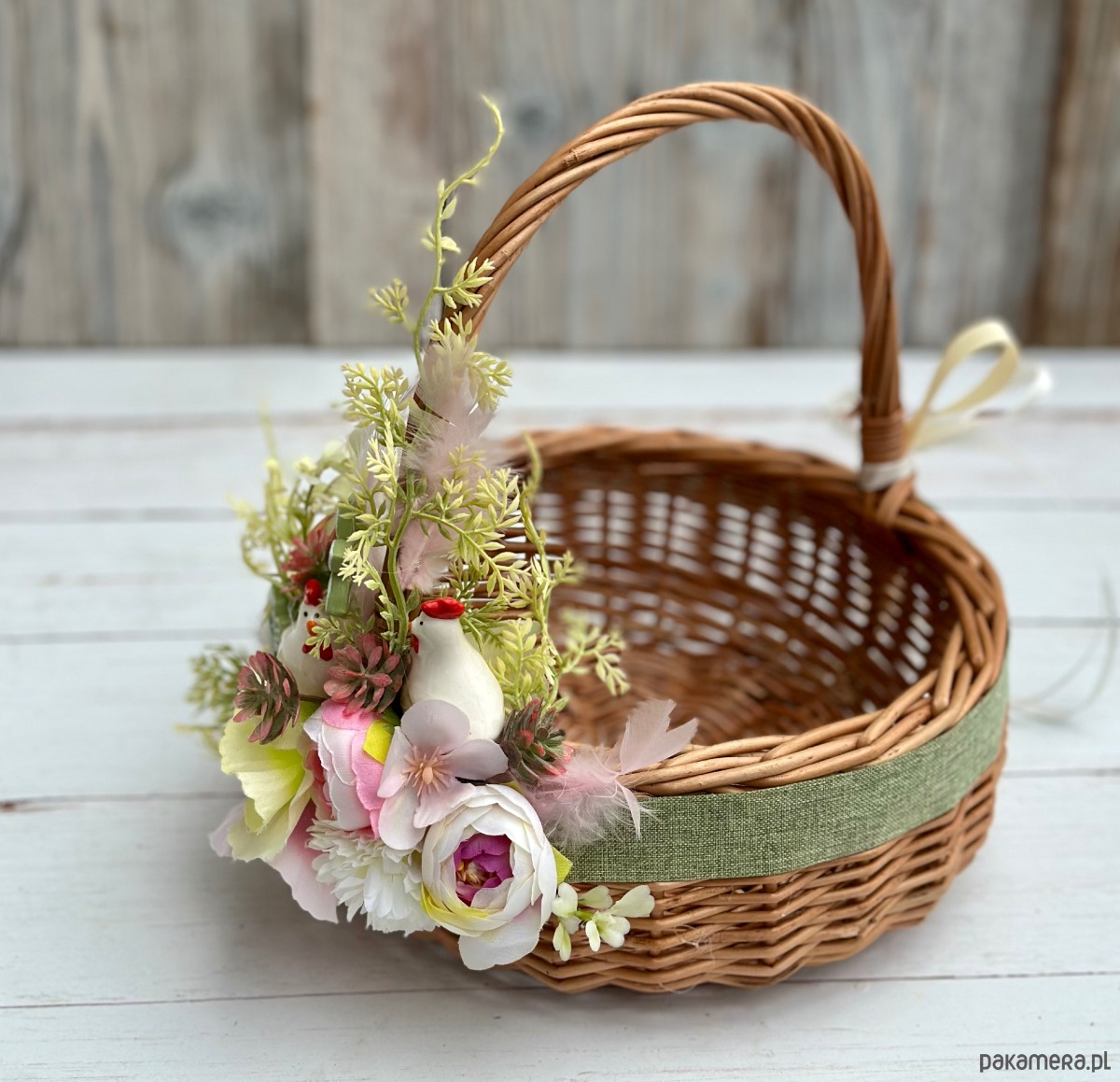Koszyczek wielkanocny z naturalnej wikliny, ozdobiony kwiatami i dodatkami sztucznymi. Dekoracja na stałe przymocowana do koszyczka, przygotowana przeze mnie ręcznie :)