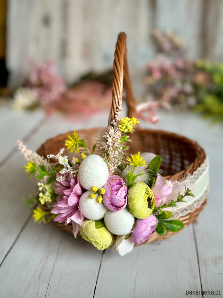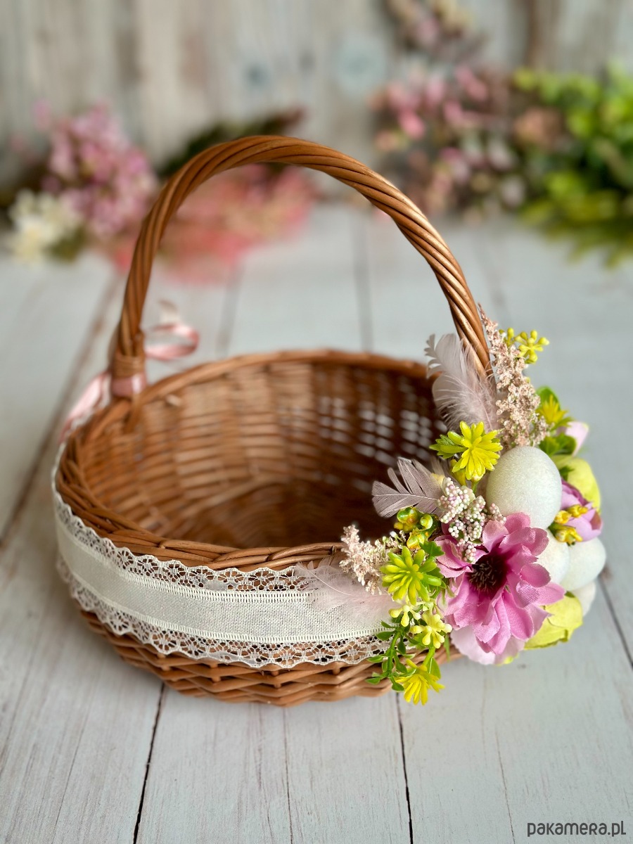Koszyczek wielkanocny z naturalnej wikliny, ozdobiony kwiatami i dodatkami sztucznymi. Dekoracja na stałe przymocowana do koszyczka, przygotowana przeze mnie ręcznie :)