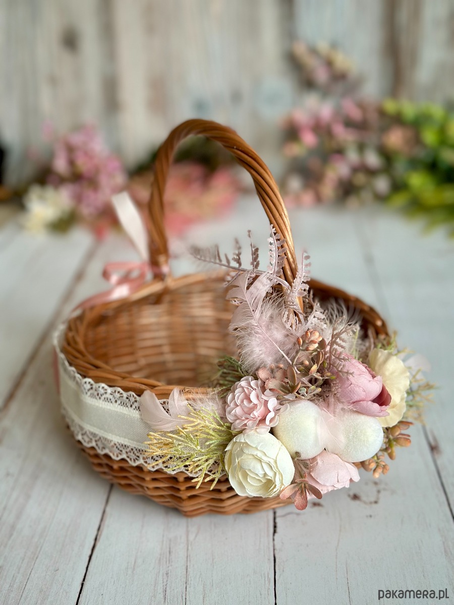 Koszyczek wielkanocny z naturalnej wikliny, ozdobiony kwiatami i dodatkami sztucznymi. Dekoracja na stałe przymocowana do koszyczka, przygotowana przeze mnie ręcznie :)