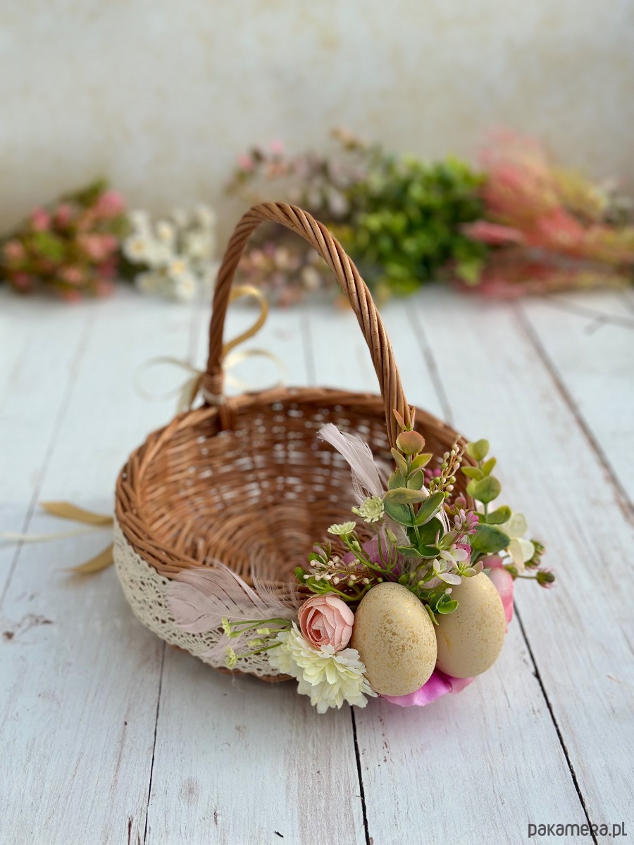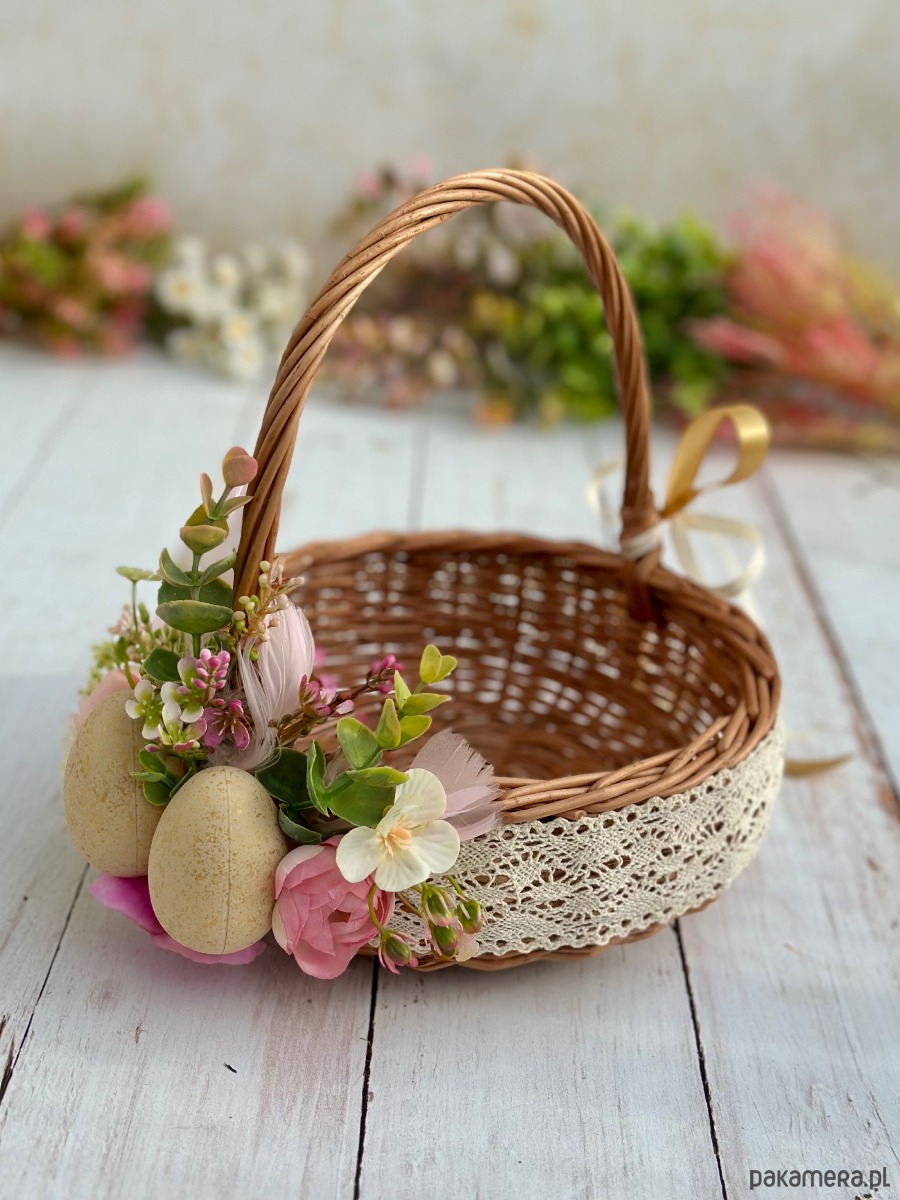 Koszyczek wielkanocny z naturalnej wikliny, ozdobiony kwiatami i dodatkami sztucznymi. Dekoracja na stałe przymocowana do koszyczka, przygotowana przeze mnie ręcznie :)