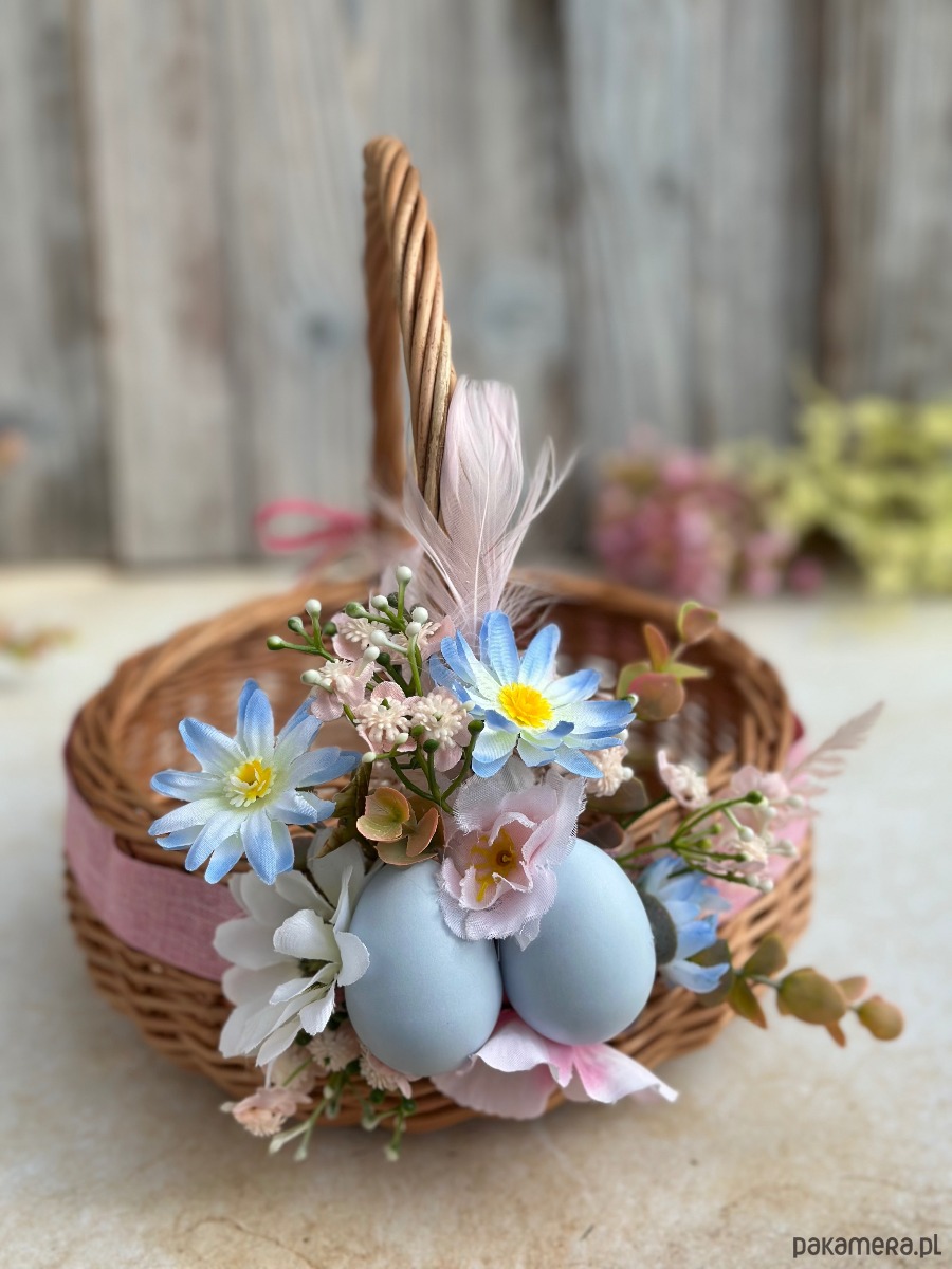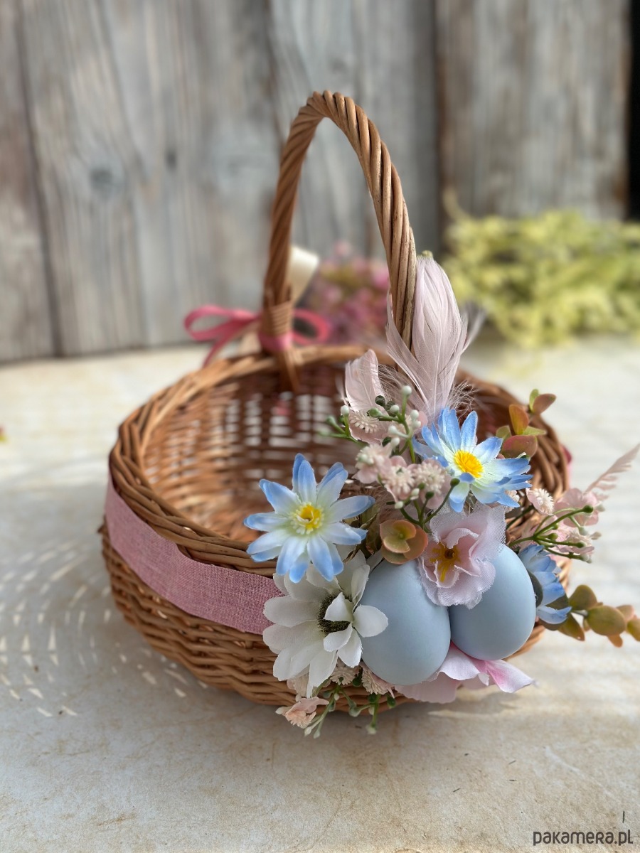 Koszyczek wielkanocny z naturalnej wikliny, ozdobiony kwiatami i dodatkami sztucznymi. Dekoracja na stałe przymocowana do koszyczka, przygotowana przeze mnie ręcznie :)