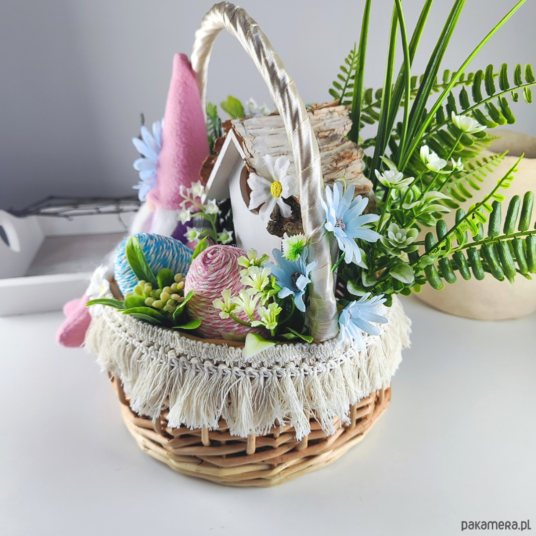 Stroik wielkanocny z gnomem. W wiklinowym koszyku jest umieszczony drewniany domek, sznurkowe pisanki oraz sztuczne kwiaty.