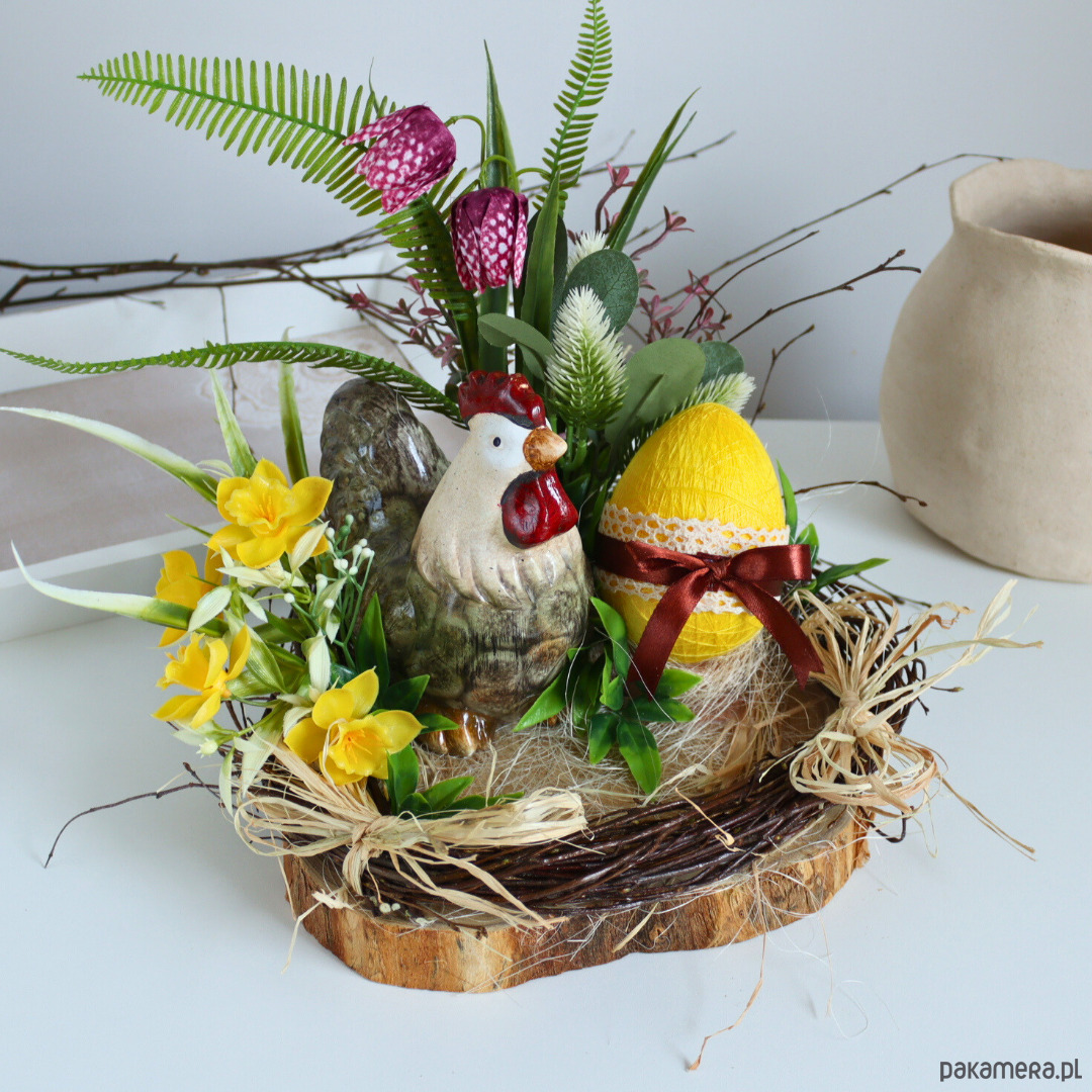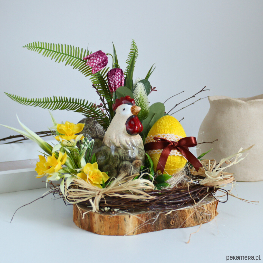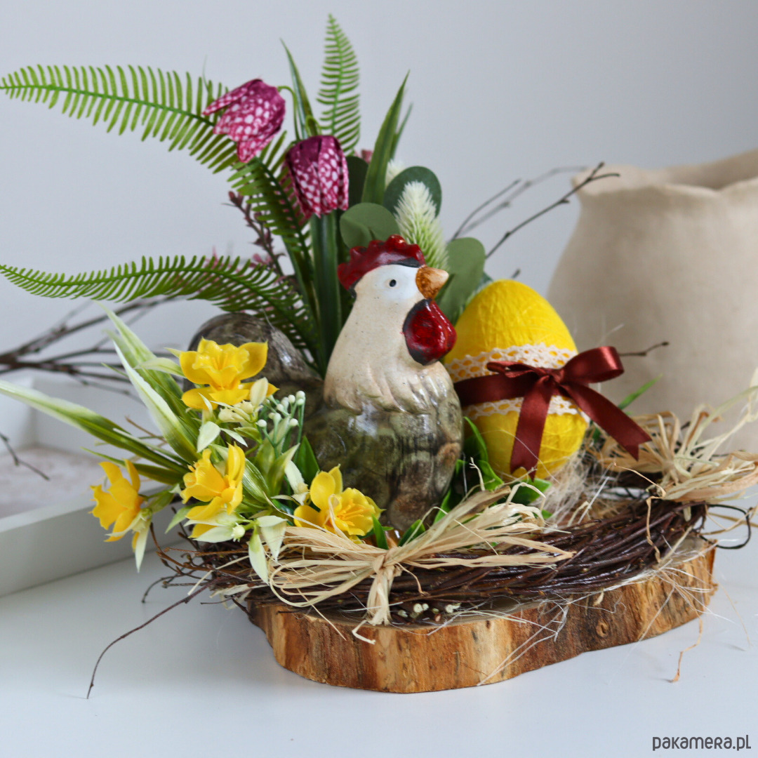 Na plastrze drewna są umieszczone: gipsowy kogut, sztuczne kwiaty, gałązki brzozy, rafia.