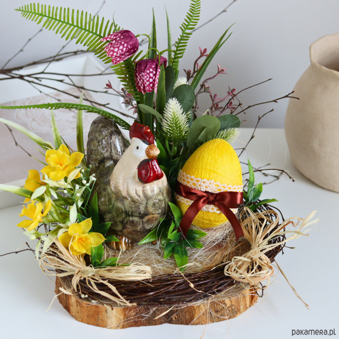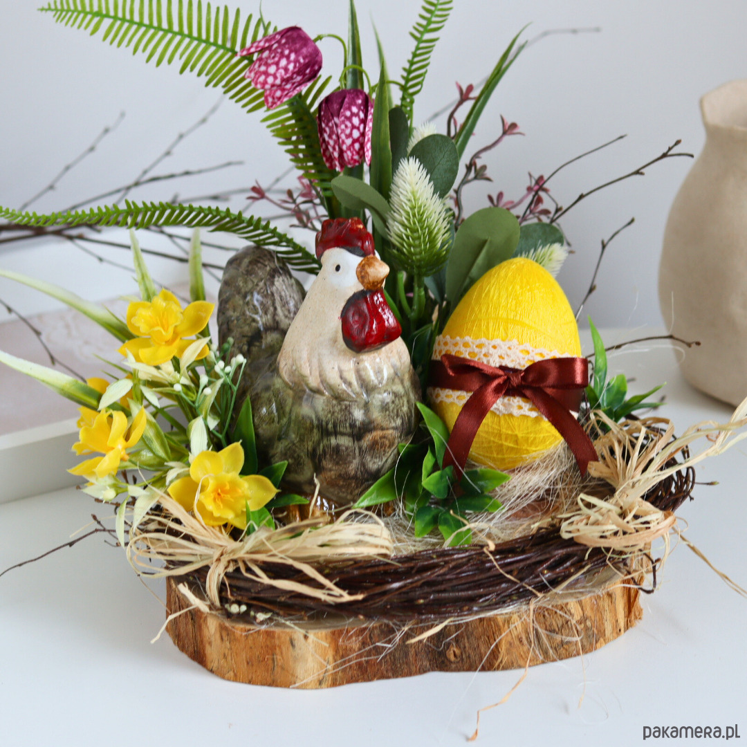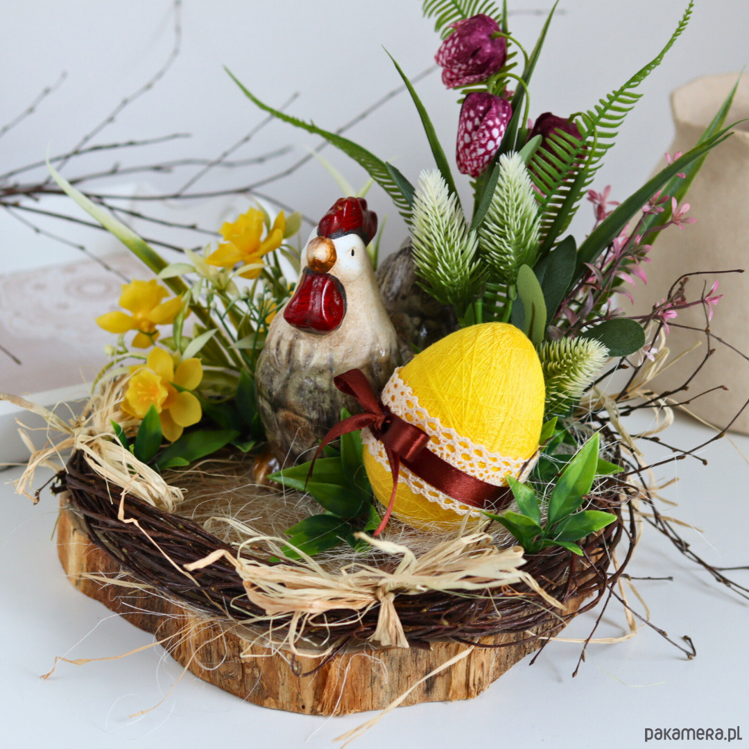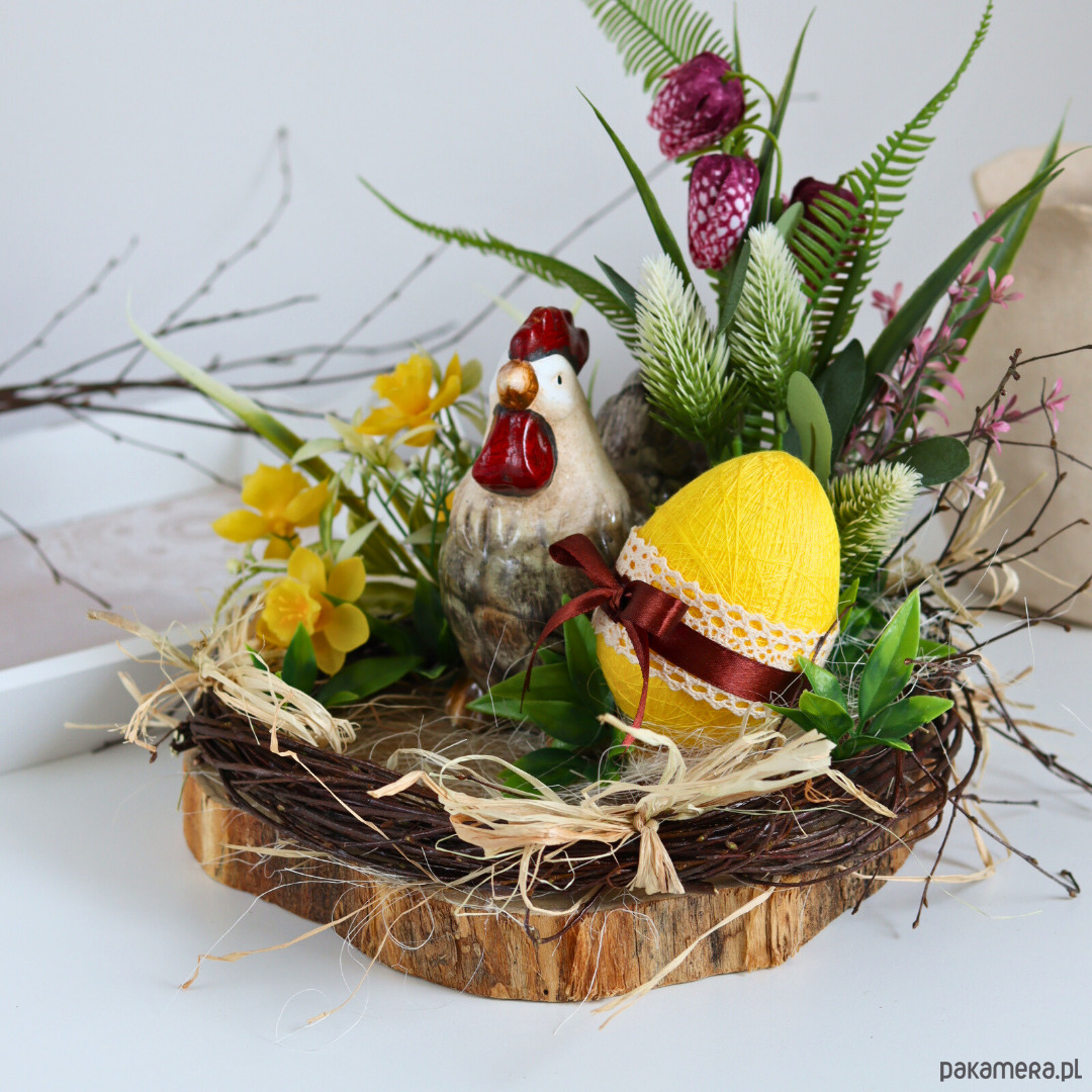 Stroik na Wielkanoc wykonany na drewnianej podstawie.