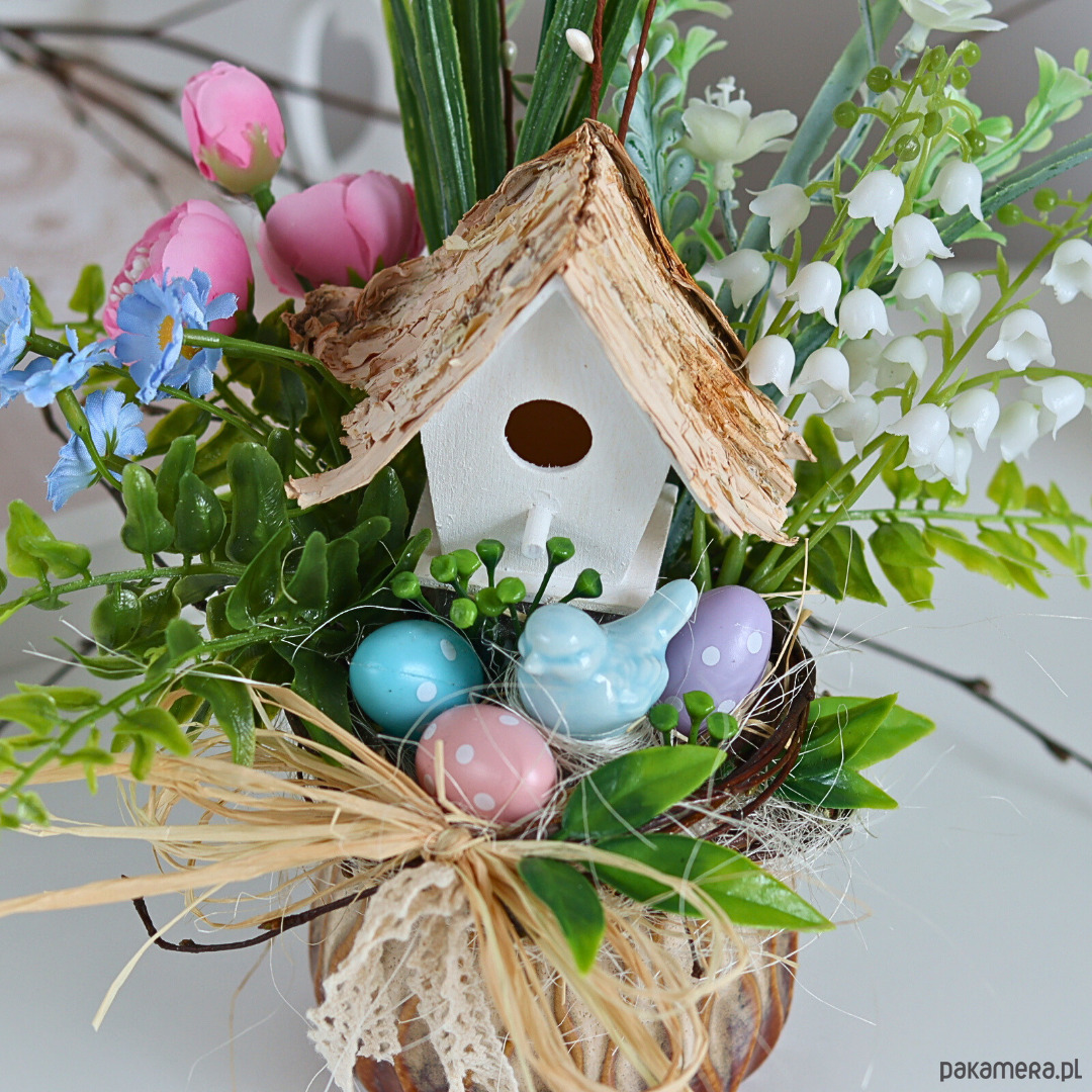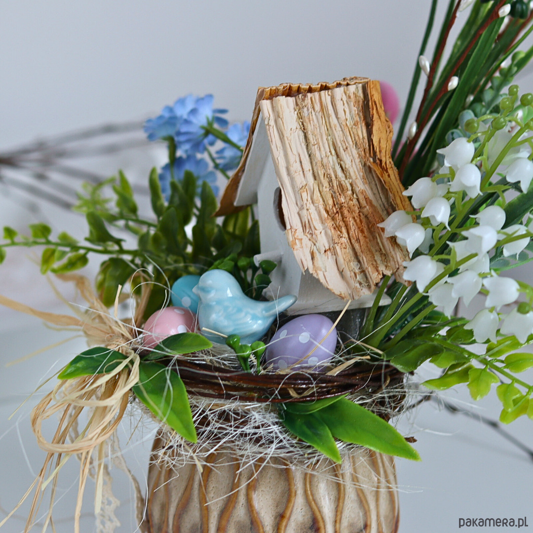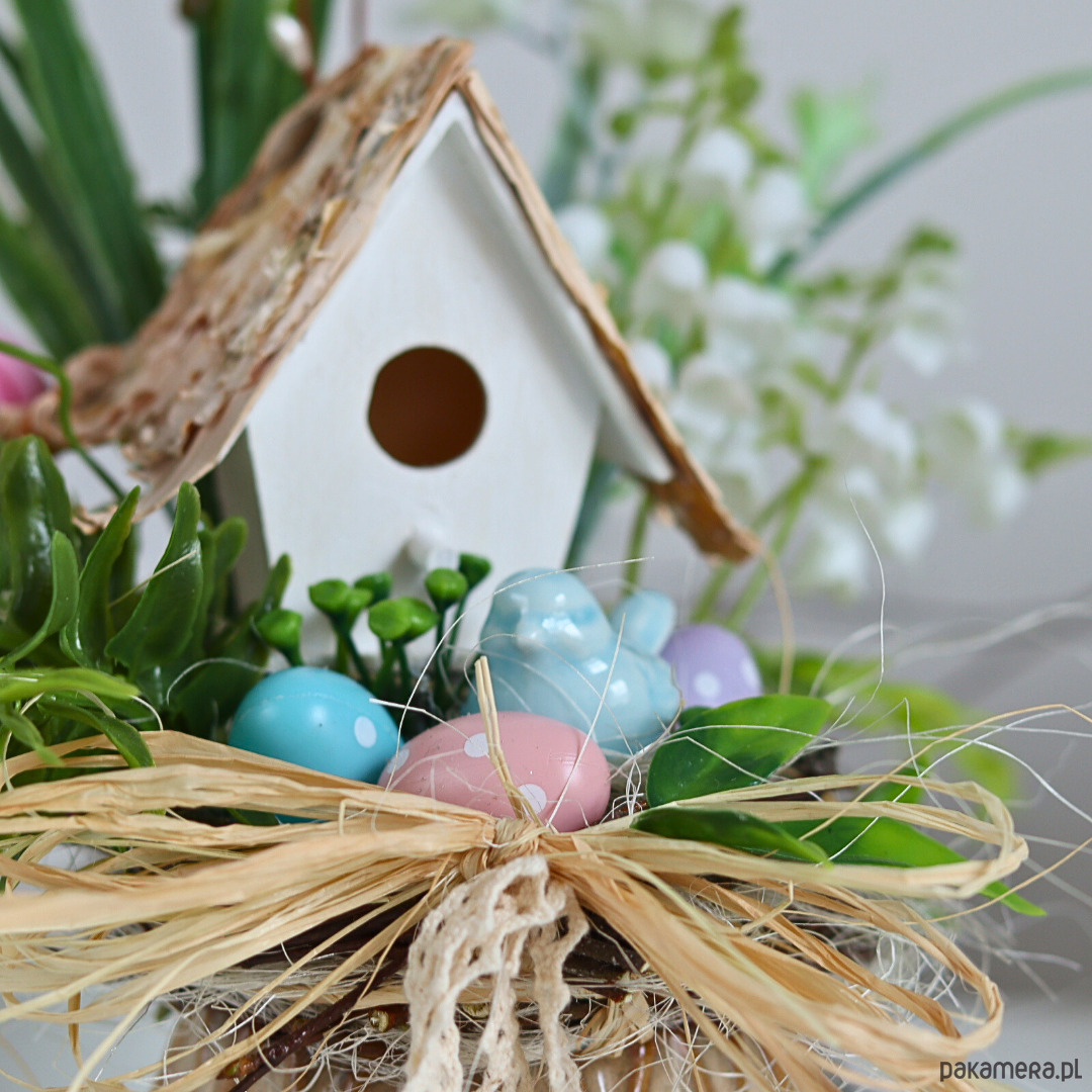 W skład stroika wchodzi: drewniany domek, plastikowe jajka (niebieski, różowy, lawendowy) w białe groszki. błękitny ptaszek, sztuczne kwiaty.