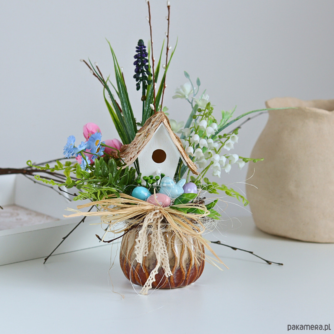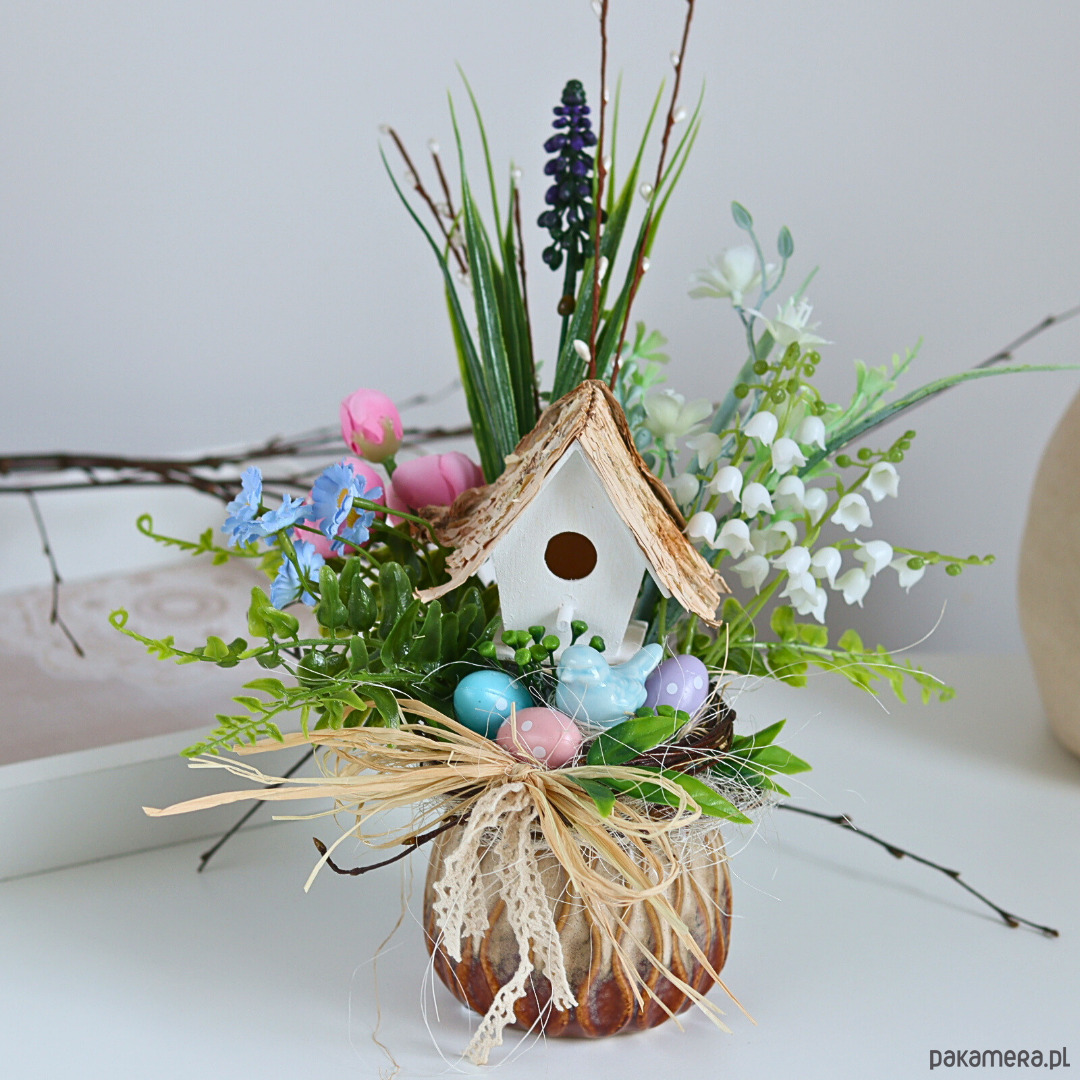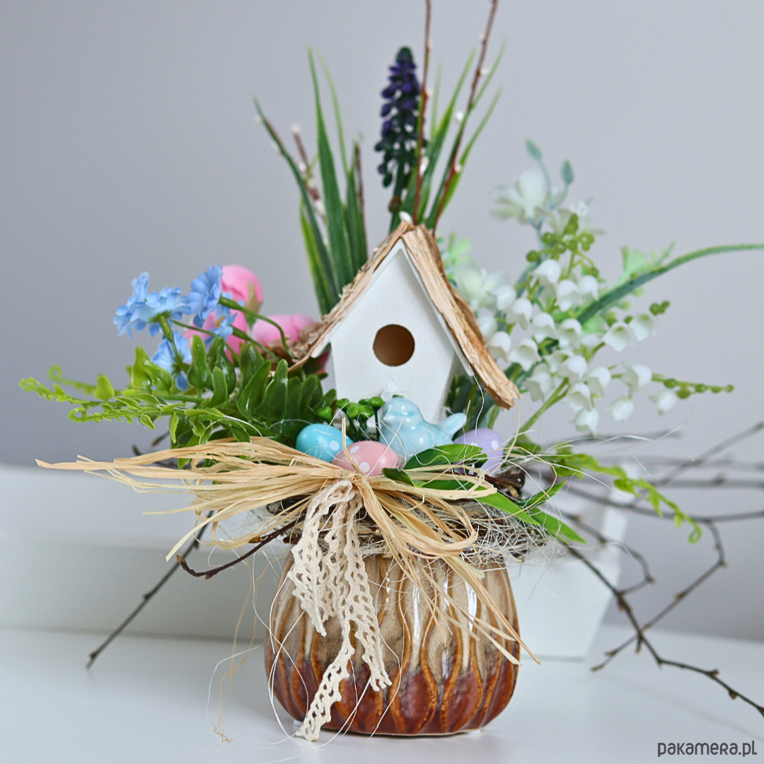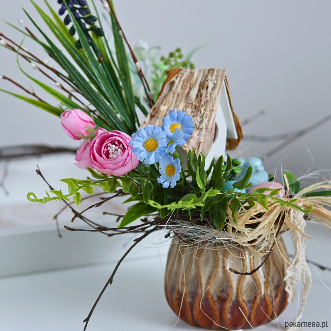 W skład stroika wchodzi: drewniany domek, plastikowe jajka (niebieski, różowy, lawendowy) w białe groszki. błękitny ptaszek, sztuczne kwiaty.