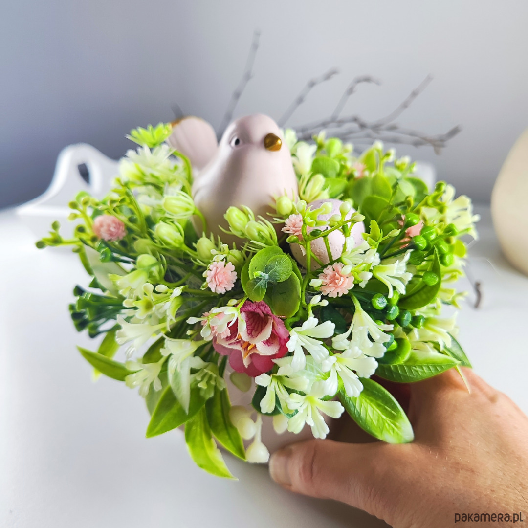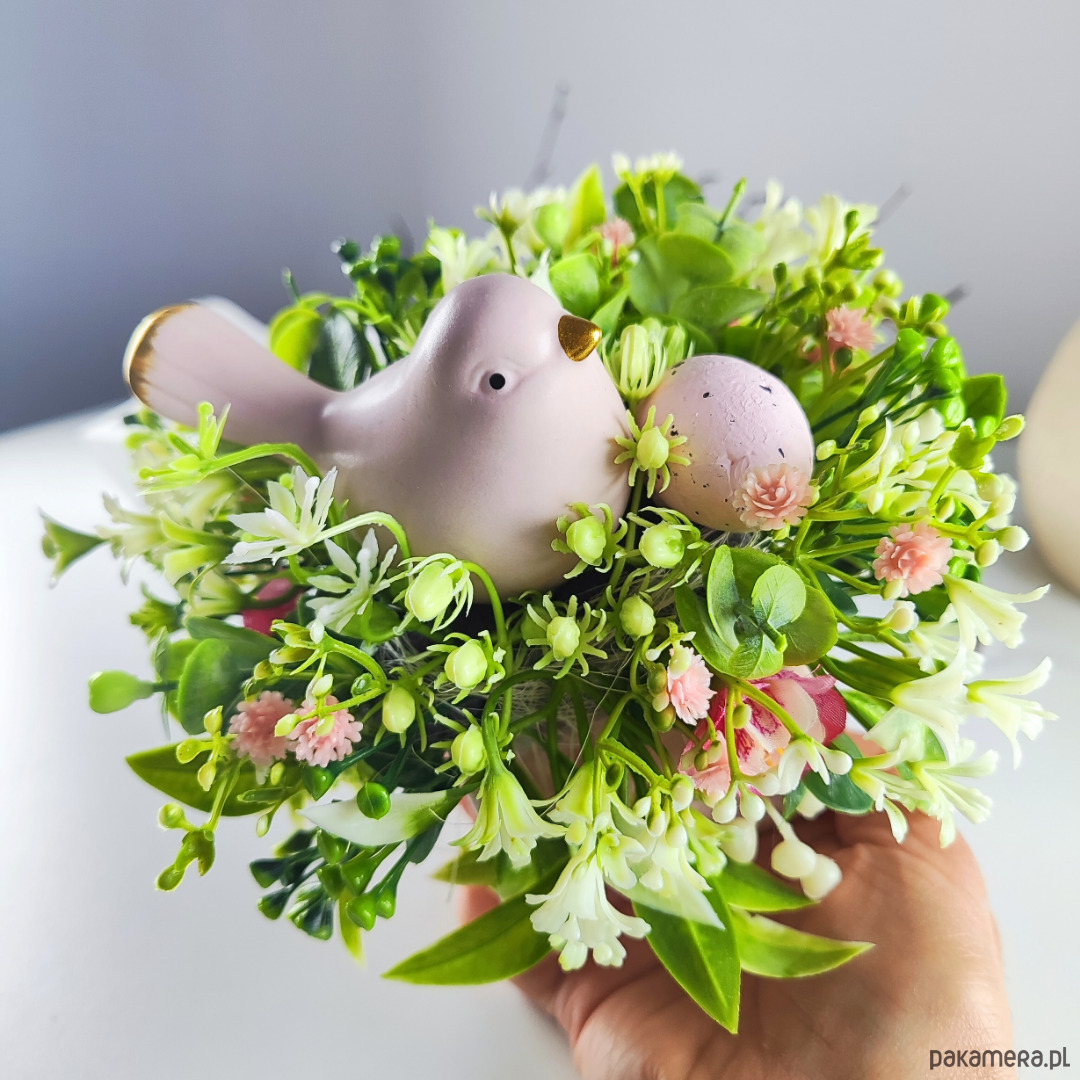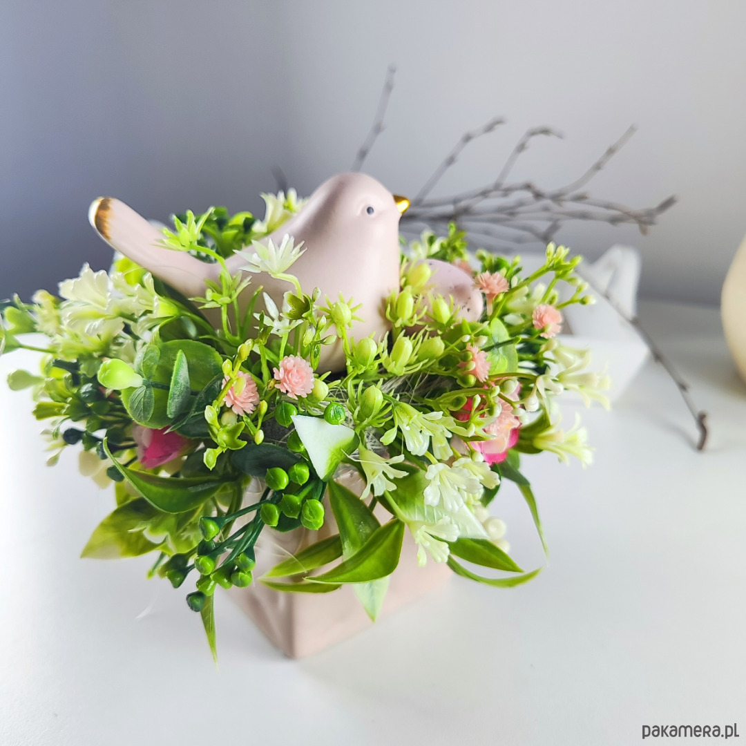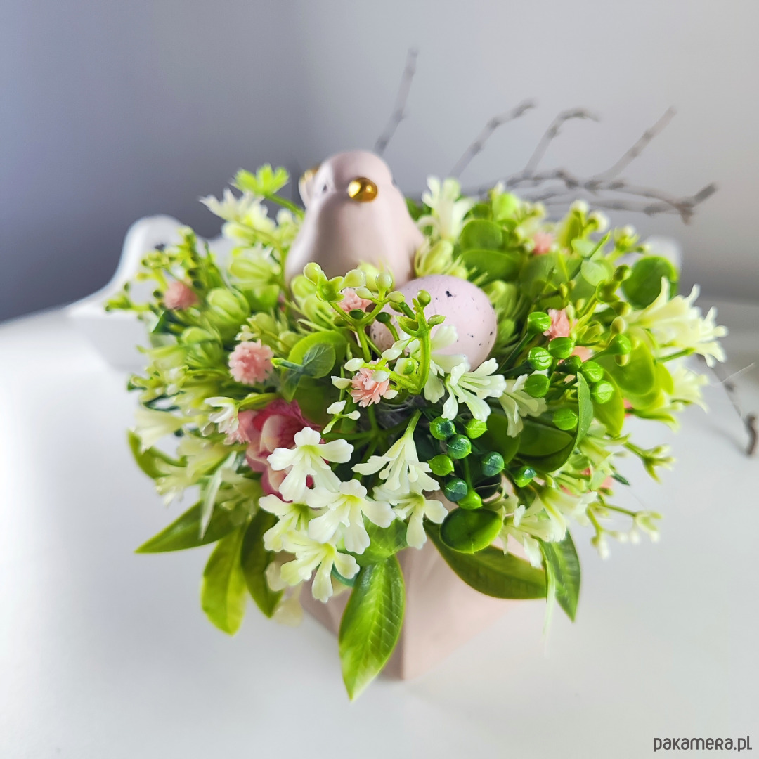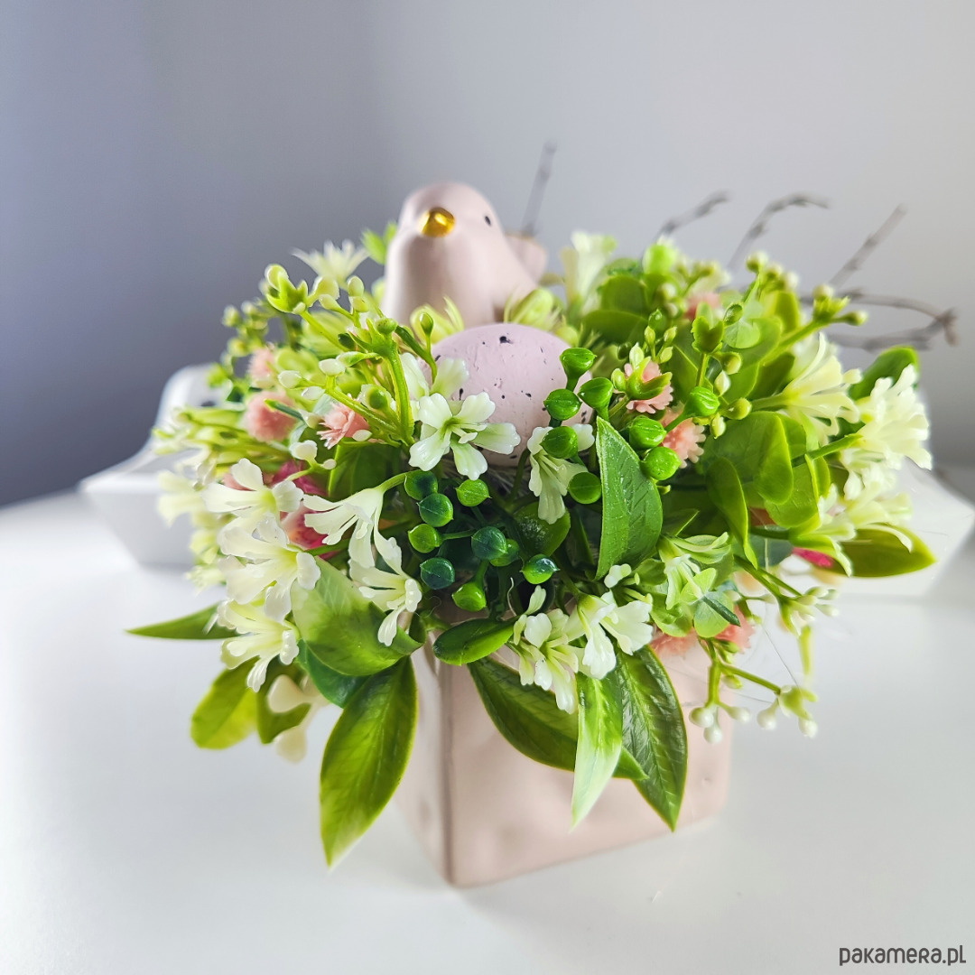 Mały stroik wielkanocny w kwadratowej, różowej doniczce.