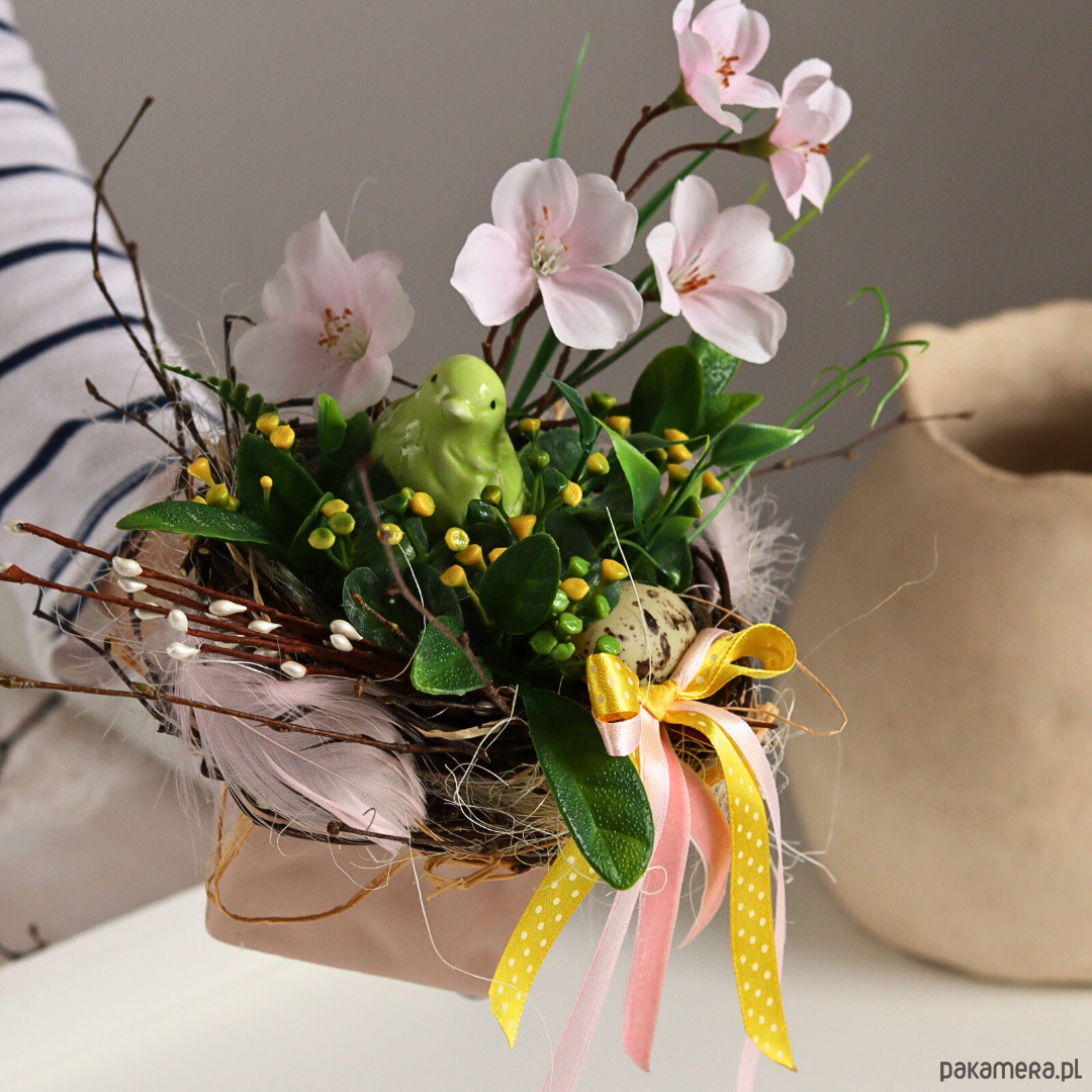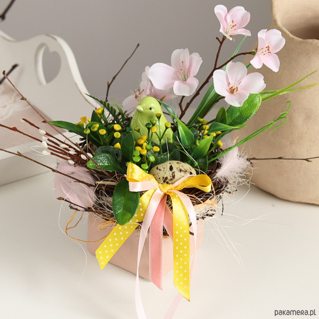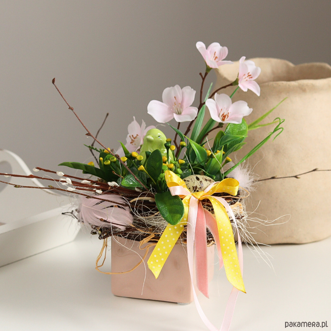 Mały stroik wielkanocny w kwadratowej doniczce w kolorze pudrowego różu.
