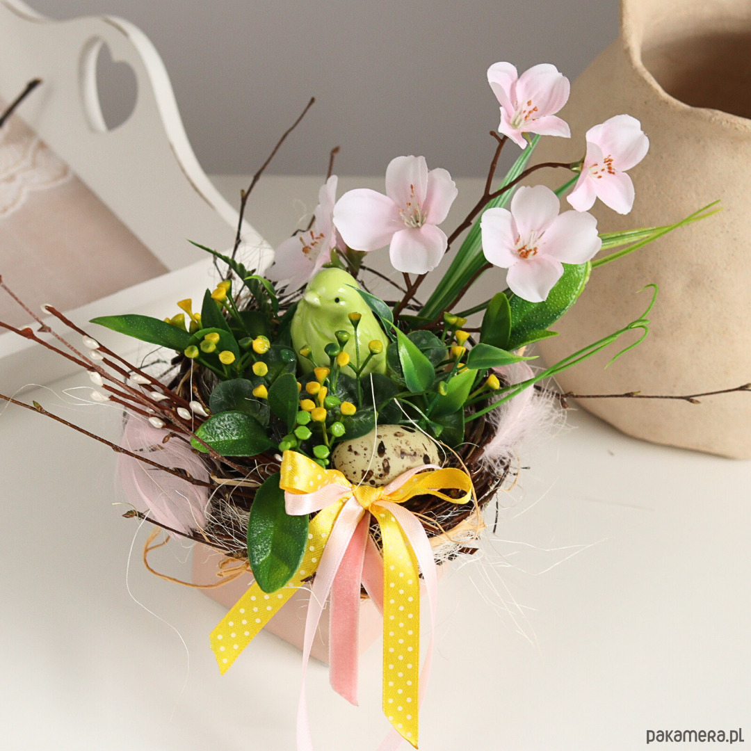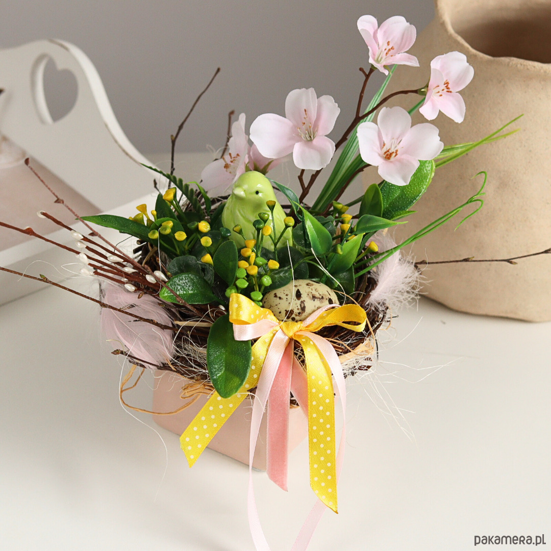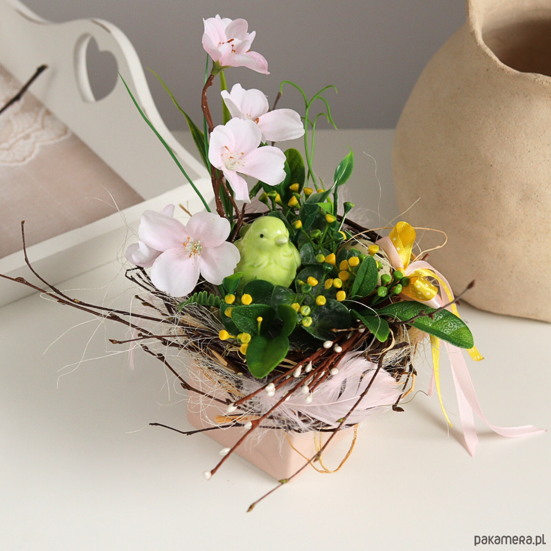 Mały stroik wielkanocny w kwadratowej doniczce w kolorze pudrowego różu.