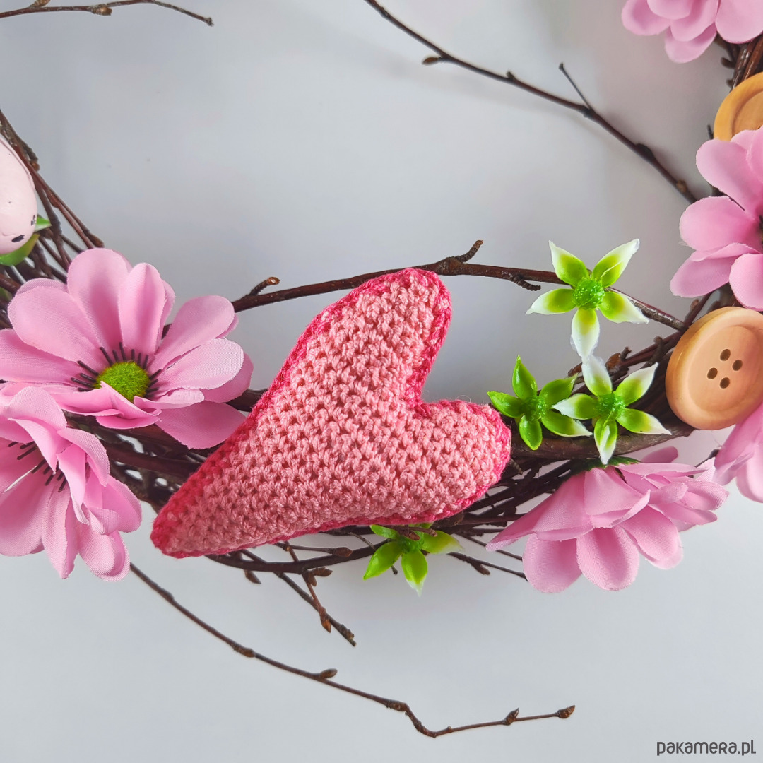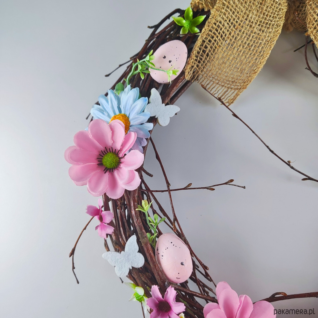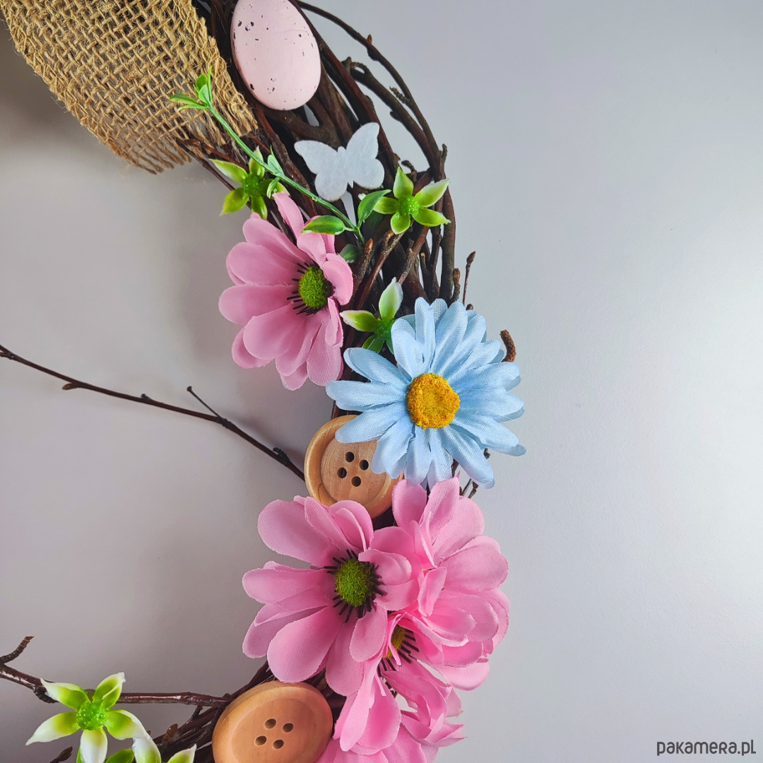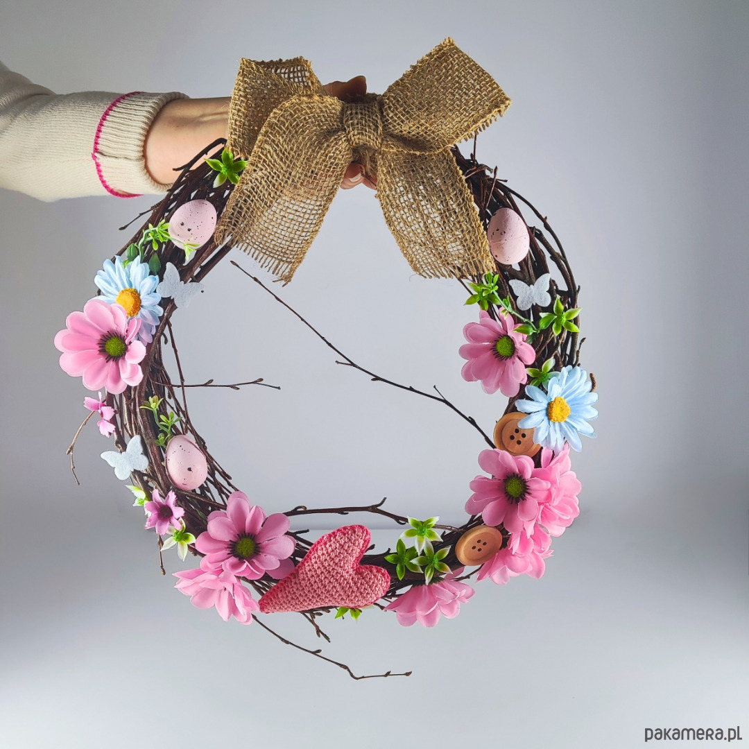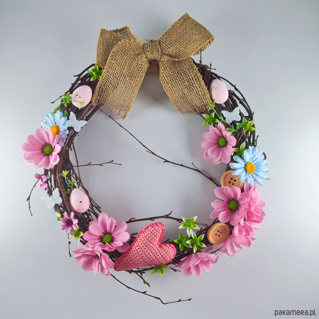 Wianek z brzozy udekorowany sztucznymi kwiatami, drewnianymi guzikami, szydełkowym sercem, styropianowymi jajkami i motylkami z filcu. Kokarda z juty.