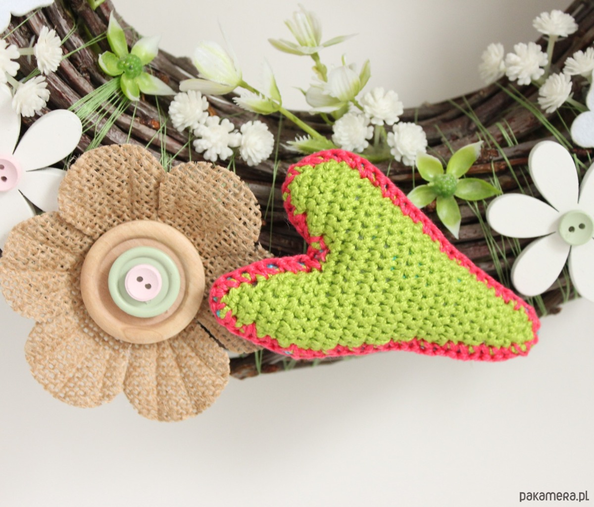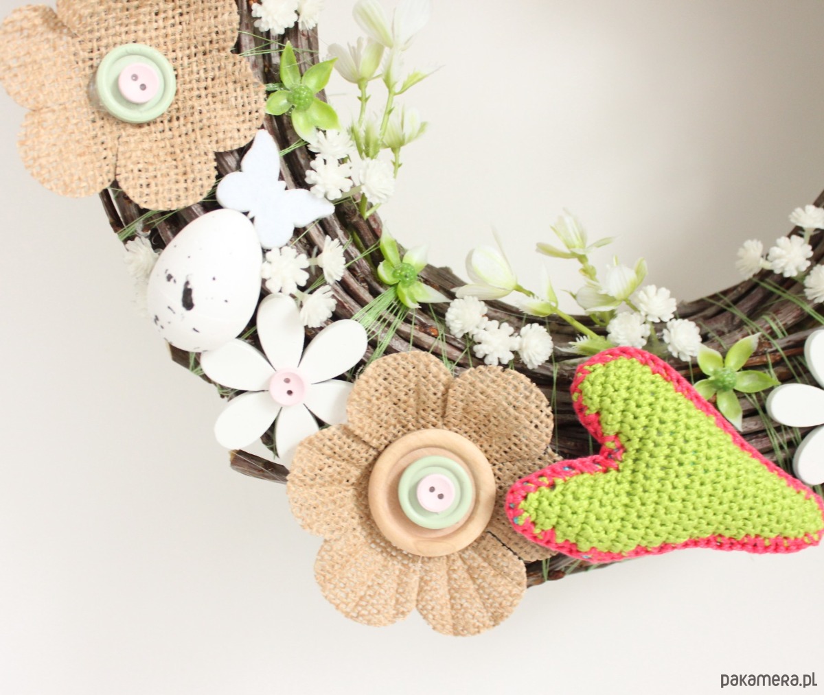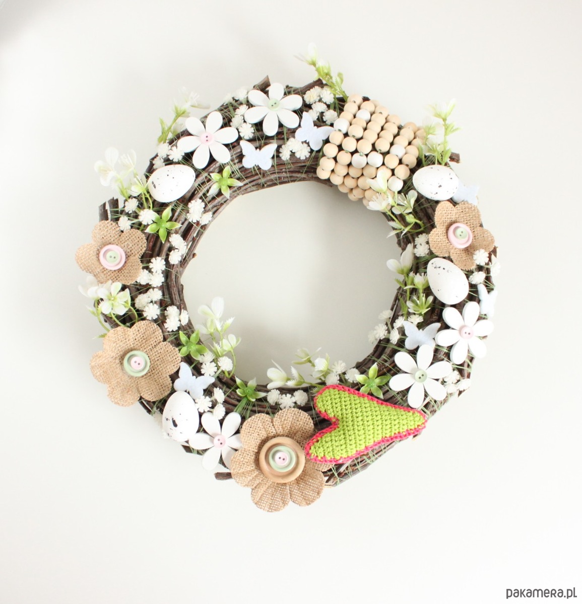 Wianek udekorowany sztucznymi kwiatami, drewnianymi koralikami, guzikami i kwiatami, szydełkowym sercem, styropianowymi jajkami i motylkami z filcu. Wianek do powieszenia na drzwi.