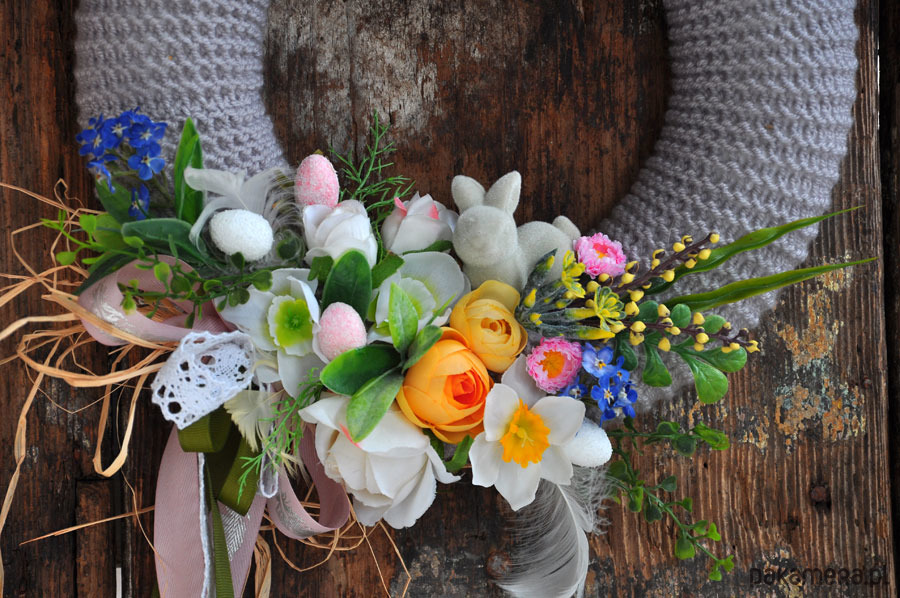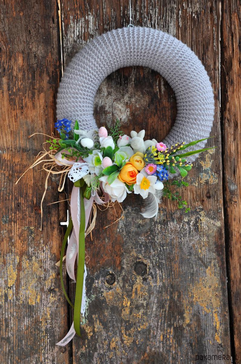 Piękny i wyjątkowy wianek wielkanocny z zajączkiem, wianek w dzierganym sweterku ; średnica ok.30cm; wianek przystosowany do powieszenia na drzwiach, ścianie lub w oknie; wianki występują w pojedynczych egzemplarzach, nie ma możliwości powtórzenia wzoru; zapraszam serdecznie