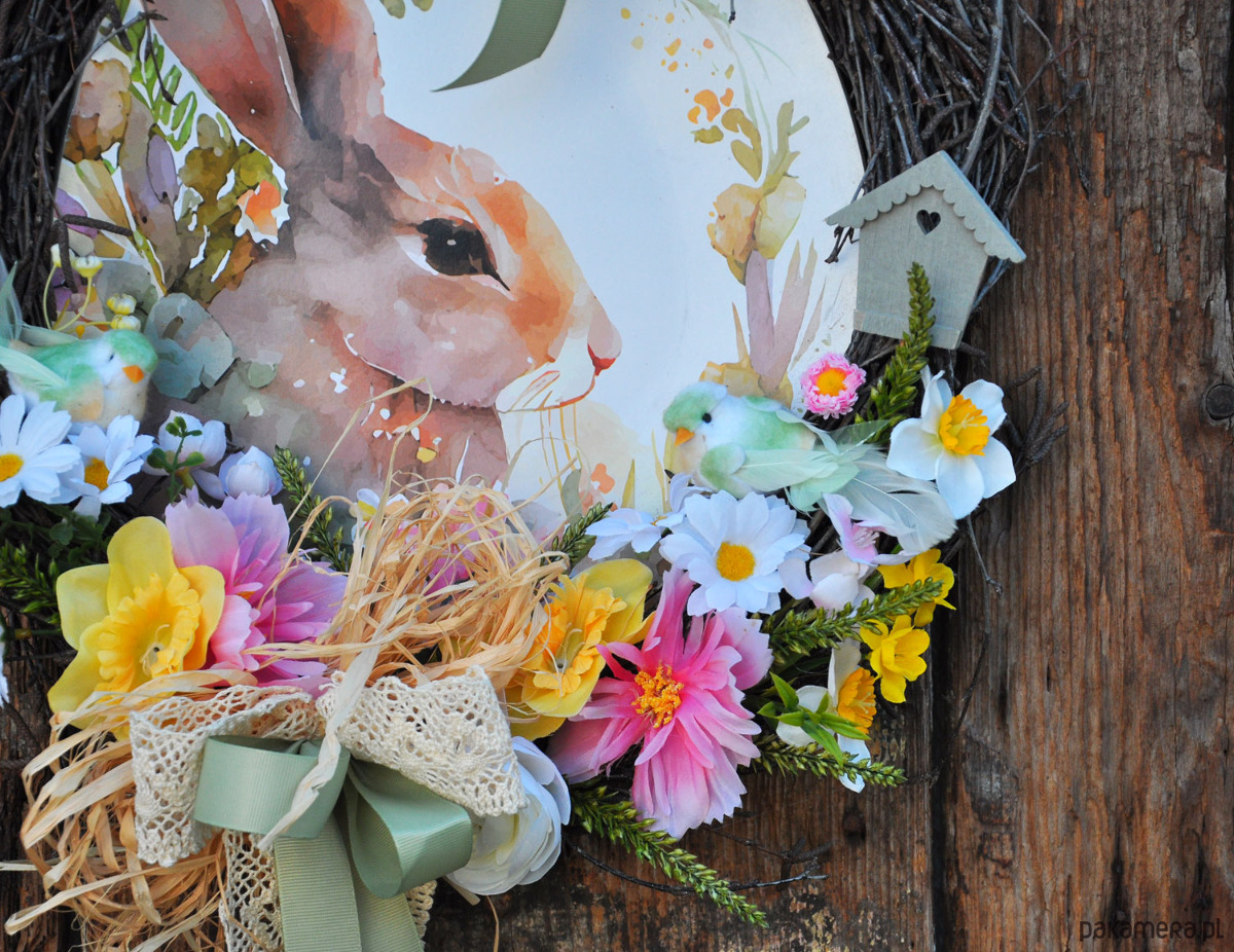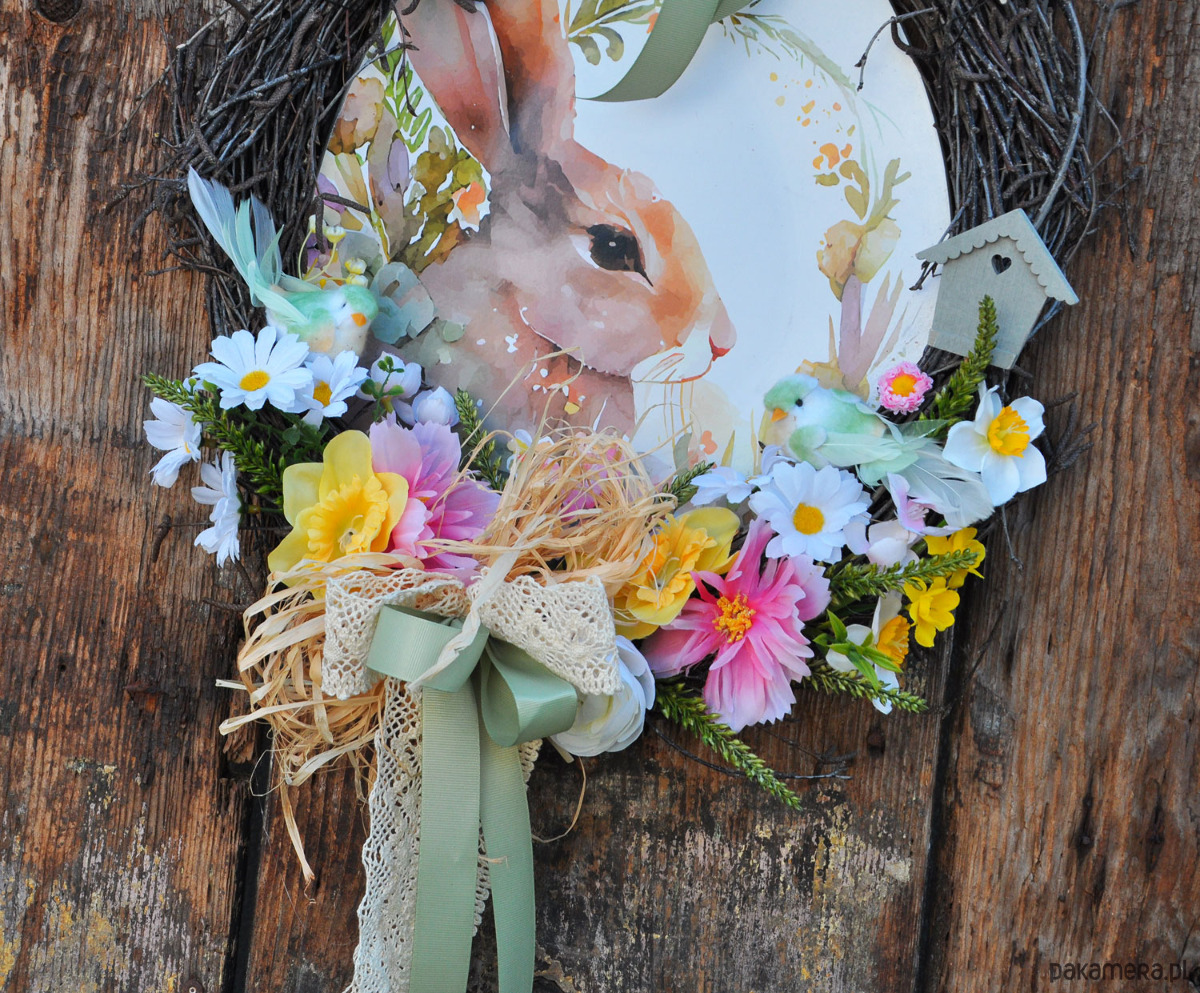 Piękny i wyjątkowy wianek wielkanocny z brzozowych gałązek otulającyh obrazek z zającem; ozdobiony sztucznymi kwiatami świetnej jakości, ptaszkami, koronką, rafią; wielkość ok.43cm/38cm; wianek przystosowany do powieszenia na drzwiach, ścianie lub w oknie; wianki występują w pojedynczych egzemplarzach, nie ma możliwości powtórzenia wzoru; zapraszam serdecznie