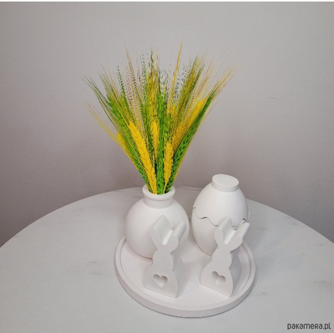 Biała ceramiczna waza z bukietem pięknych, zielono-żółtych kłosów, które dodają świeżości i naturalnego uroku.
