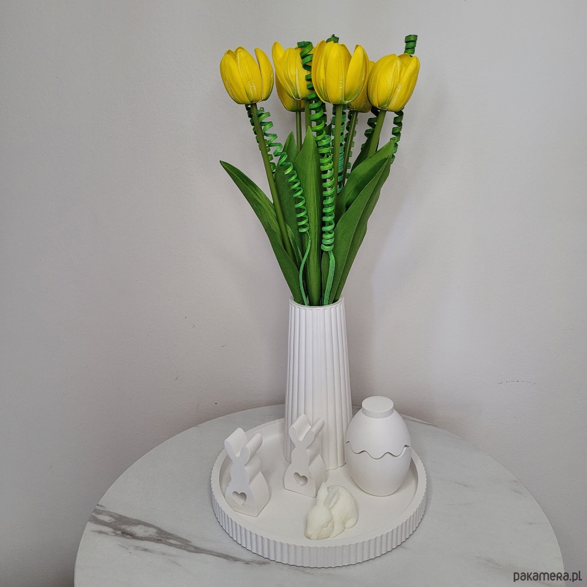 Ten stylowy zestaw to prawdziwy skarb, który stworzy przytulną i świąteczną atmosferę w Twoim domu. Elegancki biały wazon z realistycznymi tulipanami wykonanymi z wysokiej jakości silikonu, uzupełniony uroczymi gipsowymi figurkami w wielkanocnym stylu.