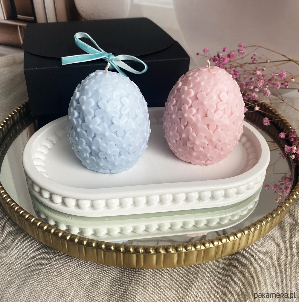 Delikatne świece/ jajka wielkanocne w subtelnym, różowym i błękitnym kolorze wraz z tacą dekoracyjną, gipsową tworzą cudowny wiosenno- wielkanocny klimat.