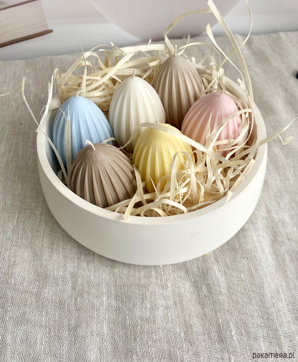 Wielkanocny zestaw Świece sojowe jajka wielkanocne w misie z gipsu i siankiem