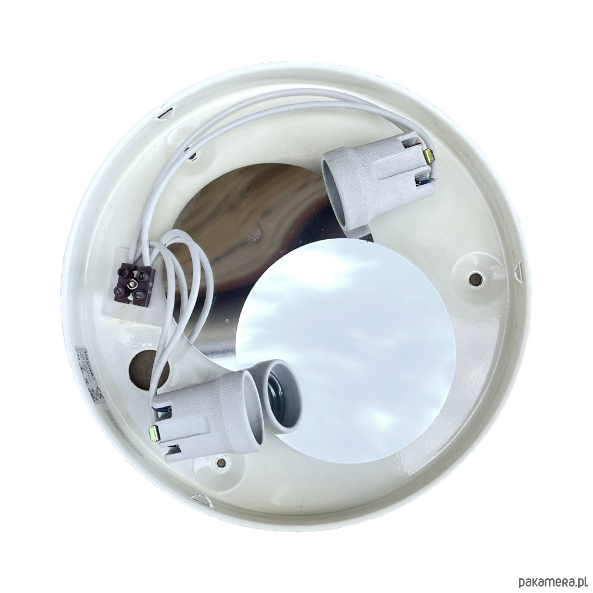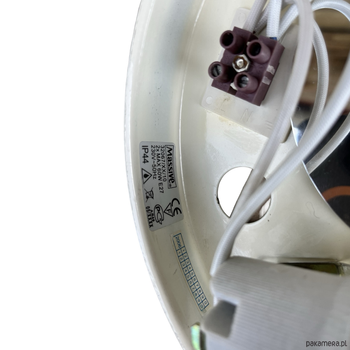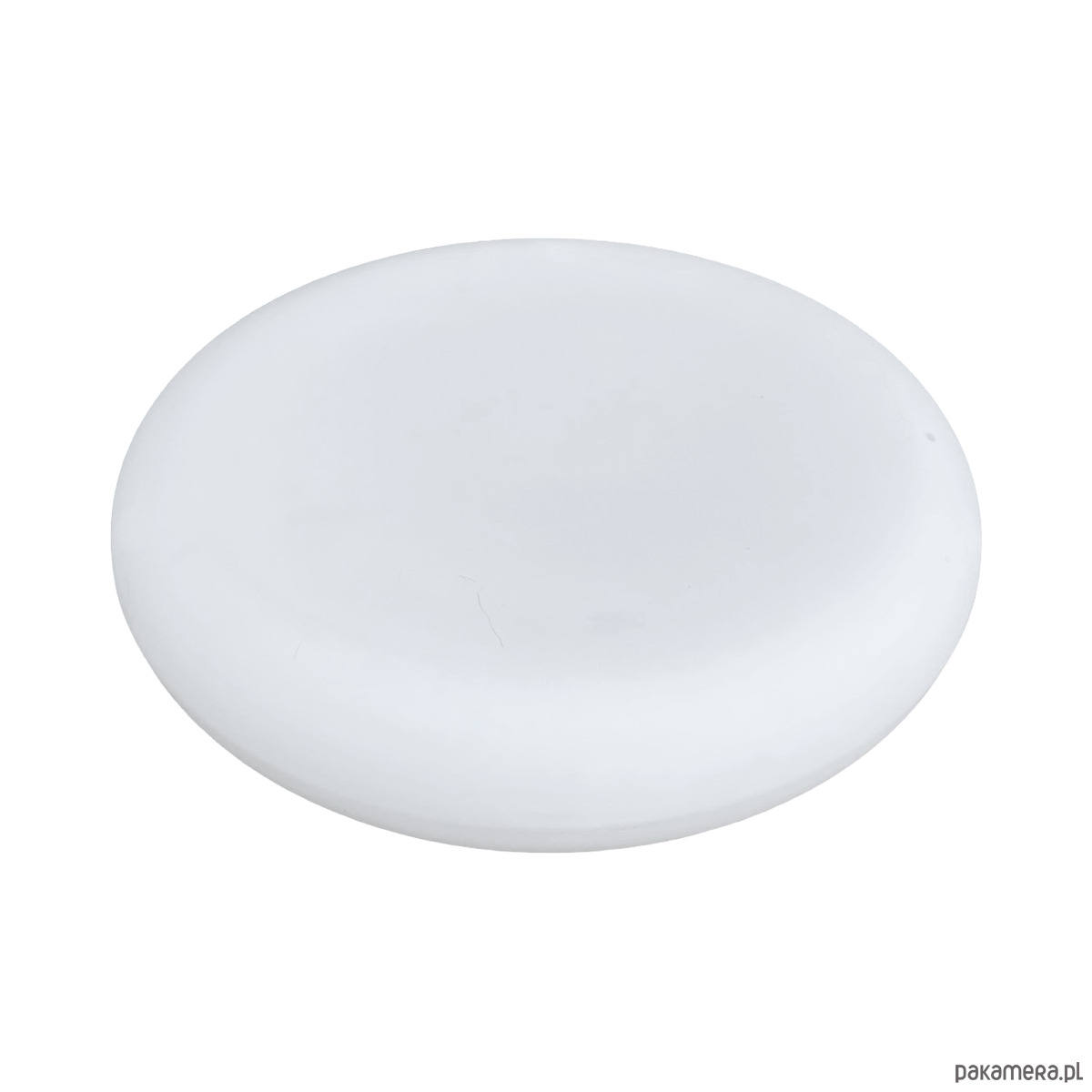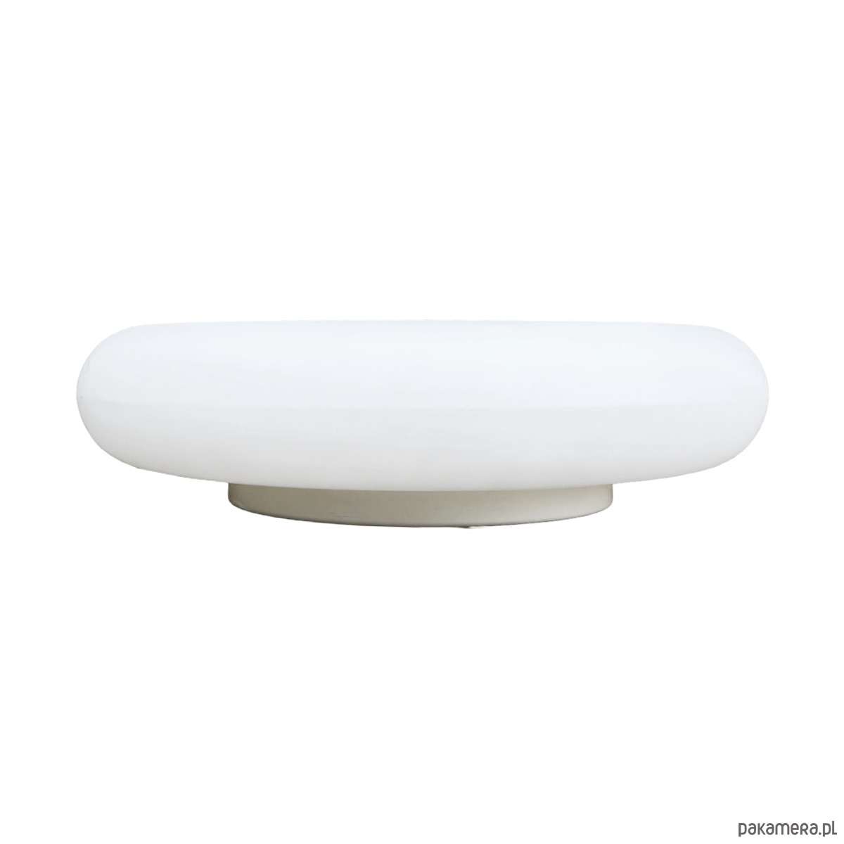 Wielki, biały, plafon ze szkła prasowego Massive wyprodukowany w latach 80. Lampa w kształcie spłaszczonego walca, tak zwana piguła. Plafon w stanie oryginalnym bardzo dobrym, z niewielkimi śladami użytkowania. Lampa działa na dwie żarówki E27 do 60W.