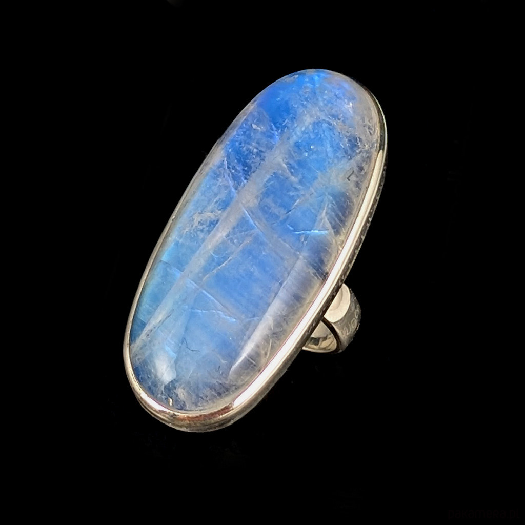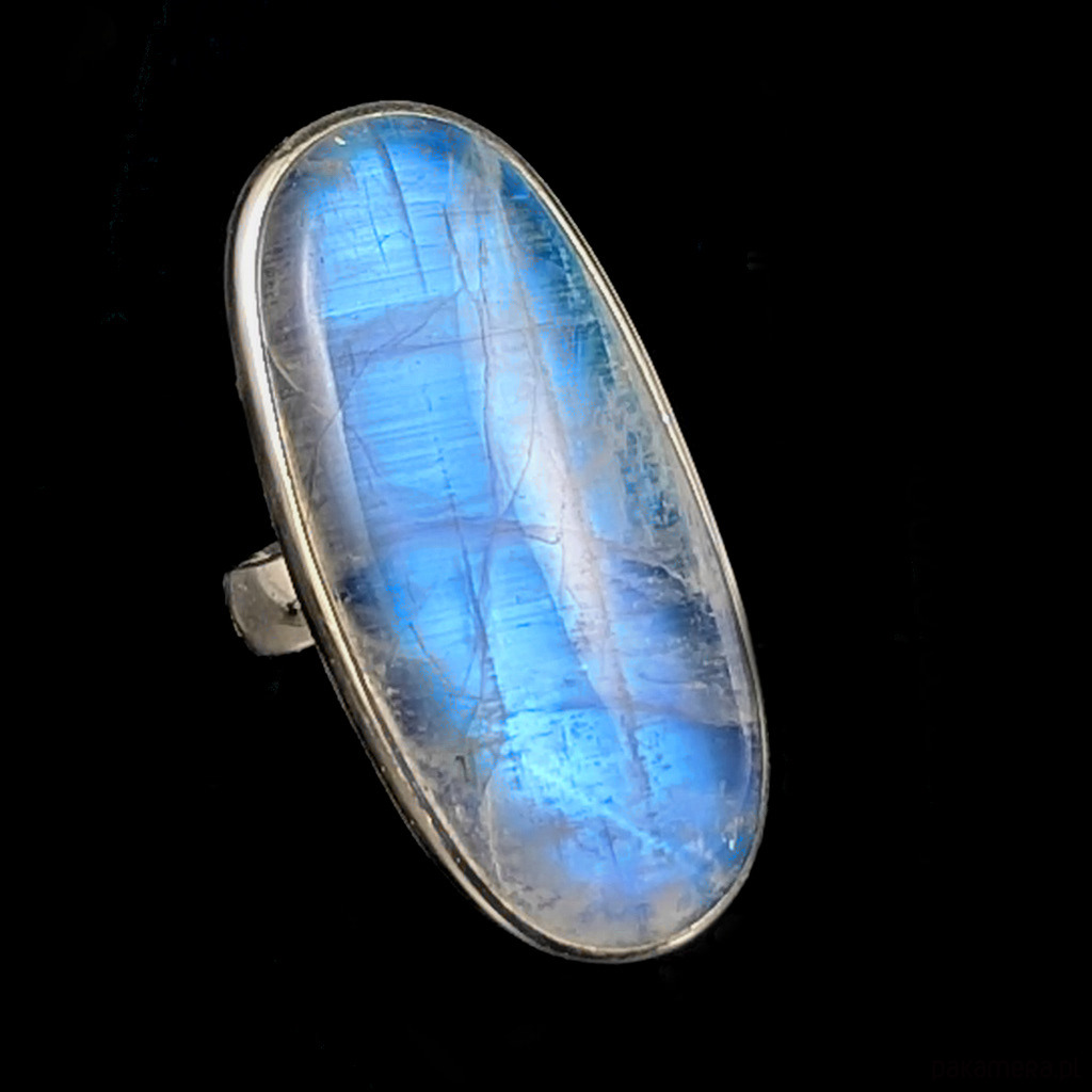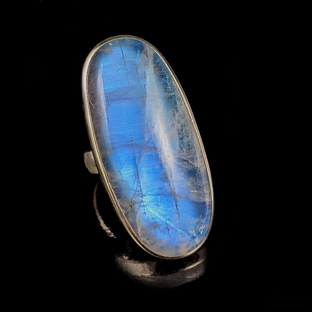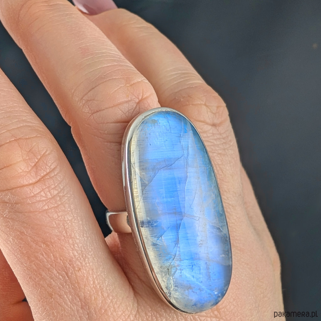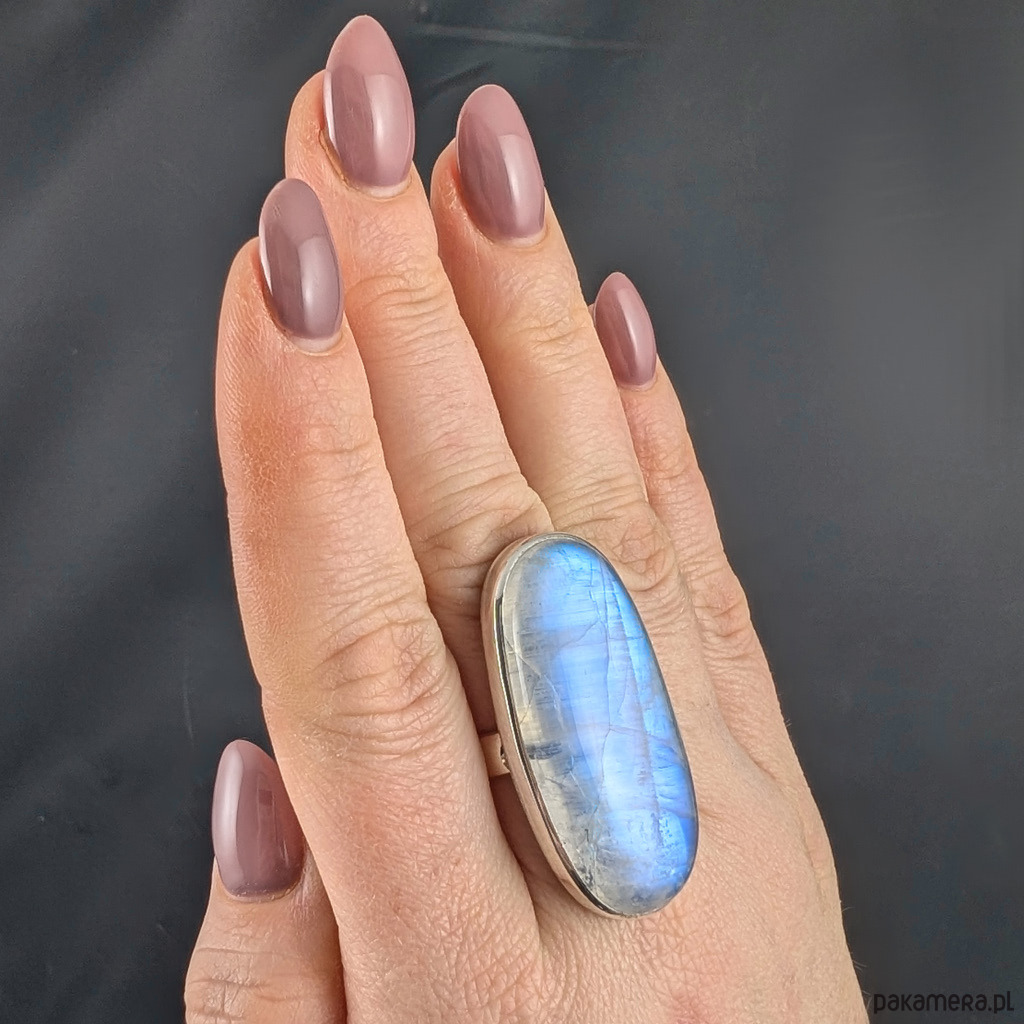 Ogromny pierścień z oprawionym w srebro próby 925 pięknym kamieniem księżycowym o błękitnej poświecie . Szerokość obrączki 5 mm. Kamień ma oprawę 42 x 22 mm. Rozmiar jubilerski regulowany w wąskim zakresie 16-21, po zakupie dopasuję do odpowiedniego rozmiaru. Waga 20 gramów. Wykonany przez dostawcę kamieni, Pierścień zapakowany zostanie w ozdobne pudełeczko.