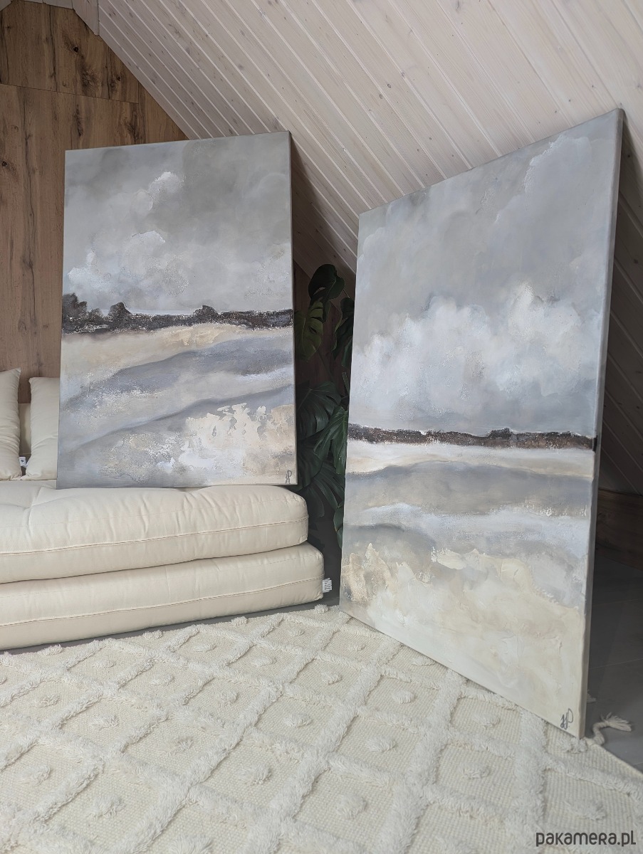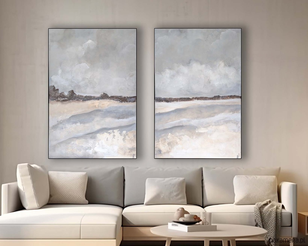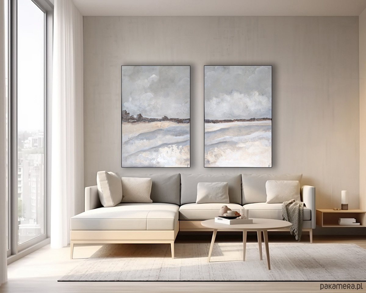 Wprowadź do swojego wnętrza odrobinę spokoju i elegancji dzięki temu oryginalnemu dyptykowi - zestawowi dwóch obrazów abstrakcyjnych. Utrzymane w stonowanej palecie beżu, szarości, bieli i taupe, obrazy inspirowane są minimalistycznym pejzażem i subtelnym światłem. Doskonale pasują do wnętrz w stylu nowoczesnym, skandynawskim lub klasycznie neutralnym.