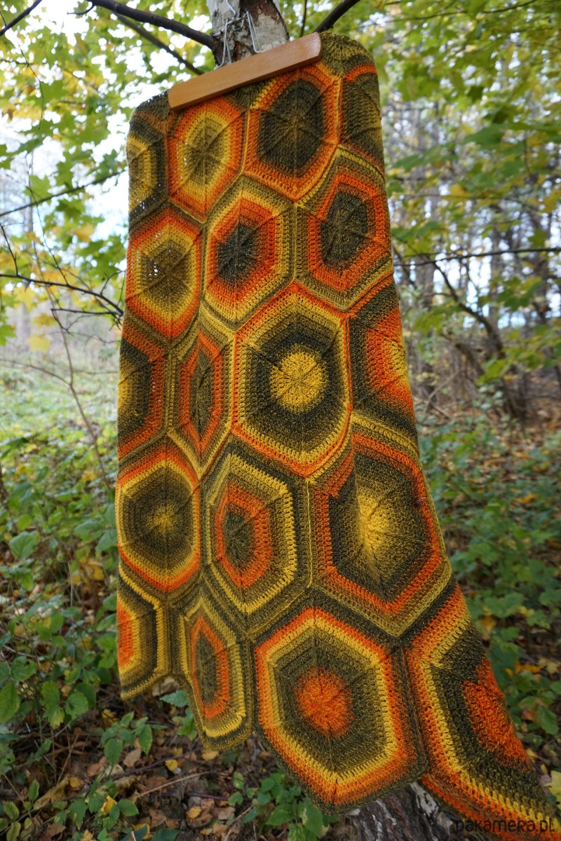 Piękna, robiona ręcznie na szydełku długa spódnica ze 100% miękkiej, niedrapiącej wełny. Powstała z osobnych elementów, które tworzą hipnotyzujący, mozaikowy wzór.