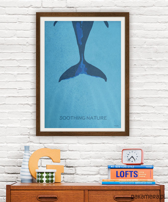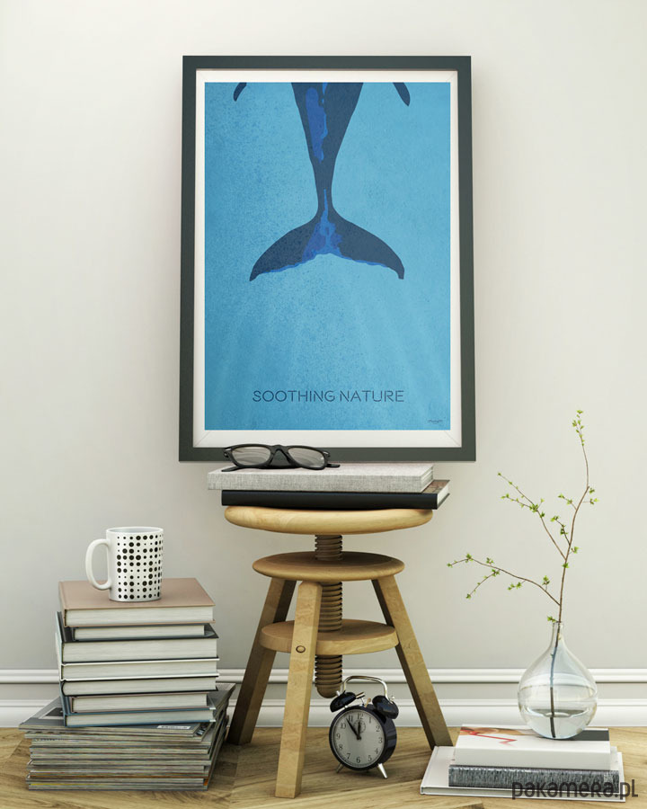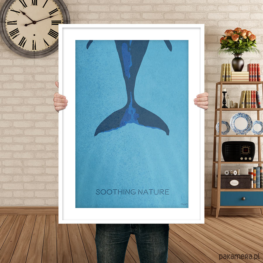 Plakat z autorską grafiką przedstawiający ogon odpływającego wieloryba z podpisem Soothing Nature (Kojąca natura).