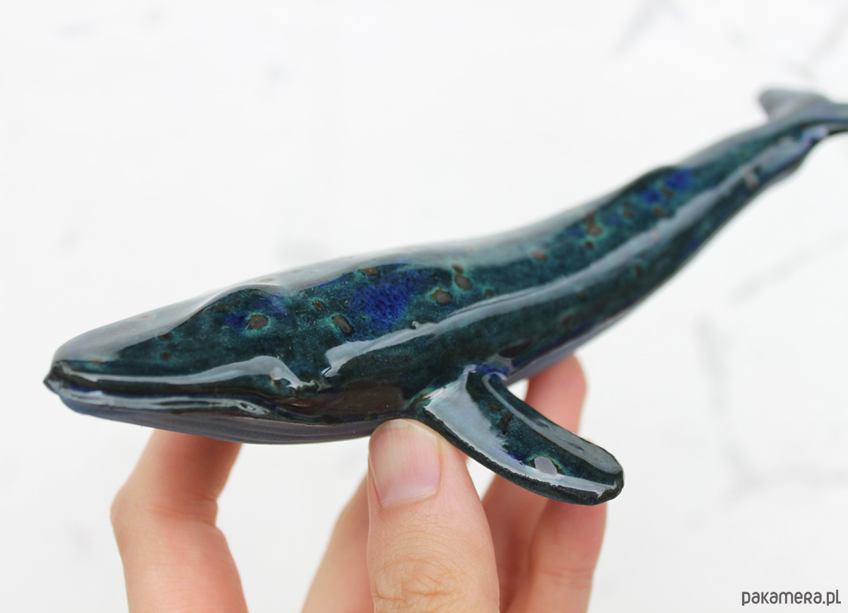 Ceramiczna figurka wieloryba, wykonana z mocno spieczonej barwionej kamionki, szkliwiona błękitno zielonym szkliwem , spód matowy niebieski, grzbiet błyszczący, długość około 18,5cm. Świetnie się prezentuje w stadzie. Wykonywany na zamówienie - rozmieszczenie kolorów może nieco różnić się od widocznego na zdjęciu