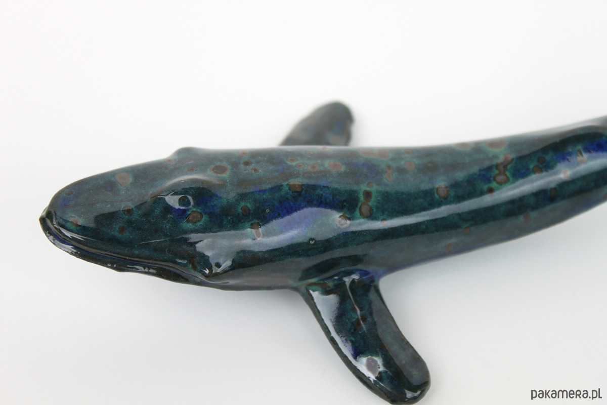 Ceramiczna figurka wieloryba, wykonana z mocno spieczonej barwionej kamionki, szkliwiona błękitno zielonym szkliwem , spód matowy niebieski, grzbiet błyszczący, długość około 18,5cm. Świetnie się prezentuje w stadzie. Wykonywany na zamówienie - rozmieszczenie kolorów może nieco różnić się od widocznego na zdjęciu