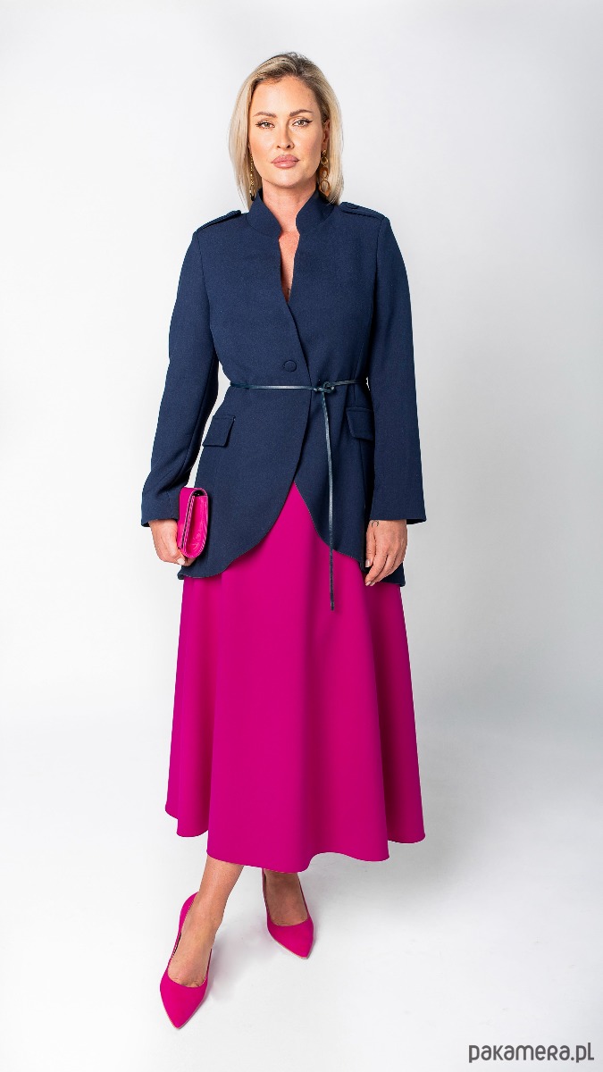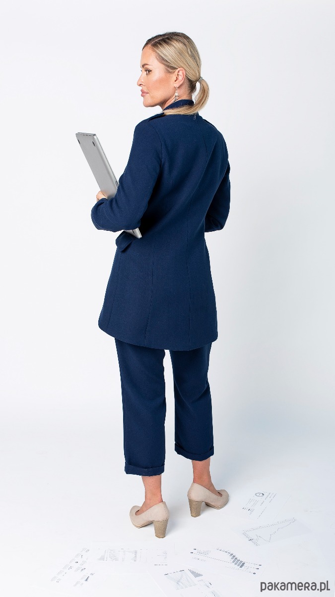 Wytworny frak z mnóstwem detali: eleganckie pagony w ramionach, wywijane rękawy wykończone miłą w dotyku oddychającą podszewką, kobiecy taliowany krój wydłużony z tyłu, delikatna stójka, poduszki w ramionach
