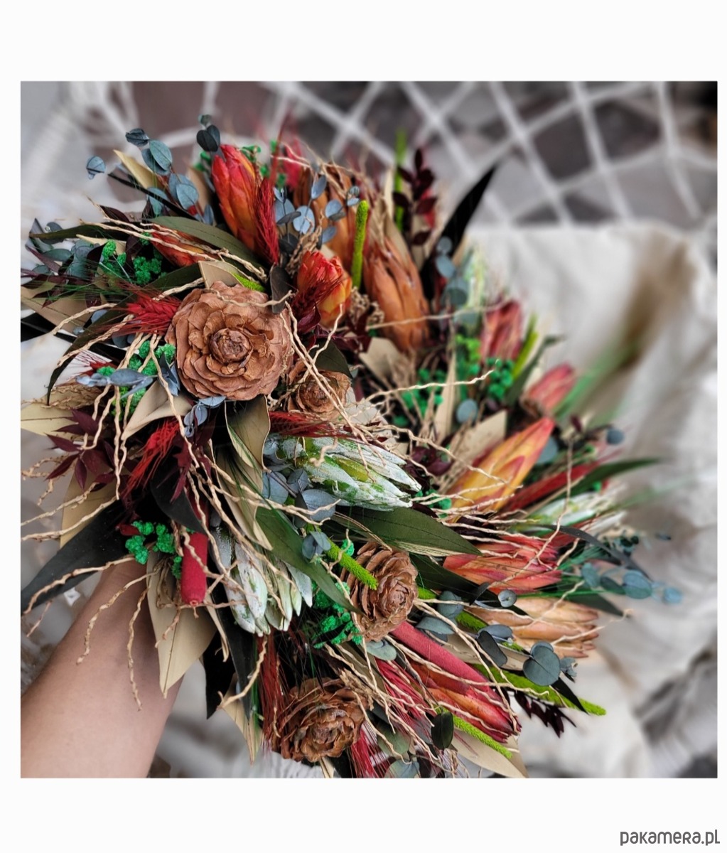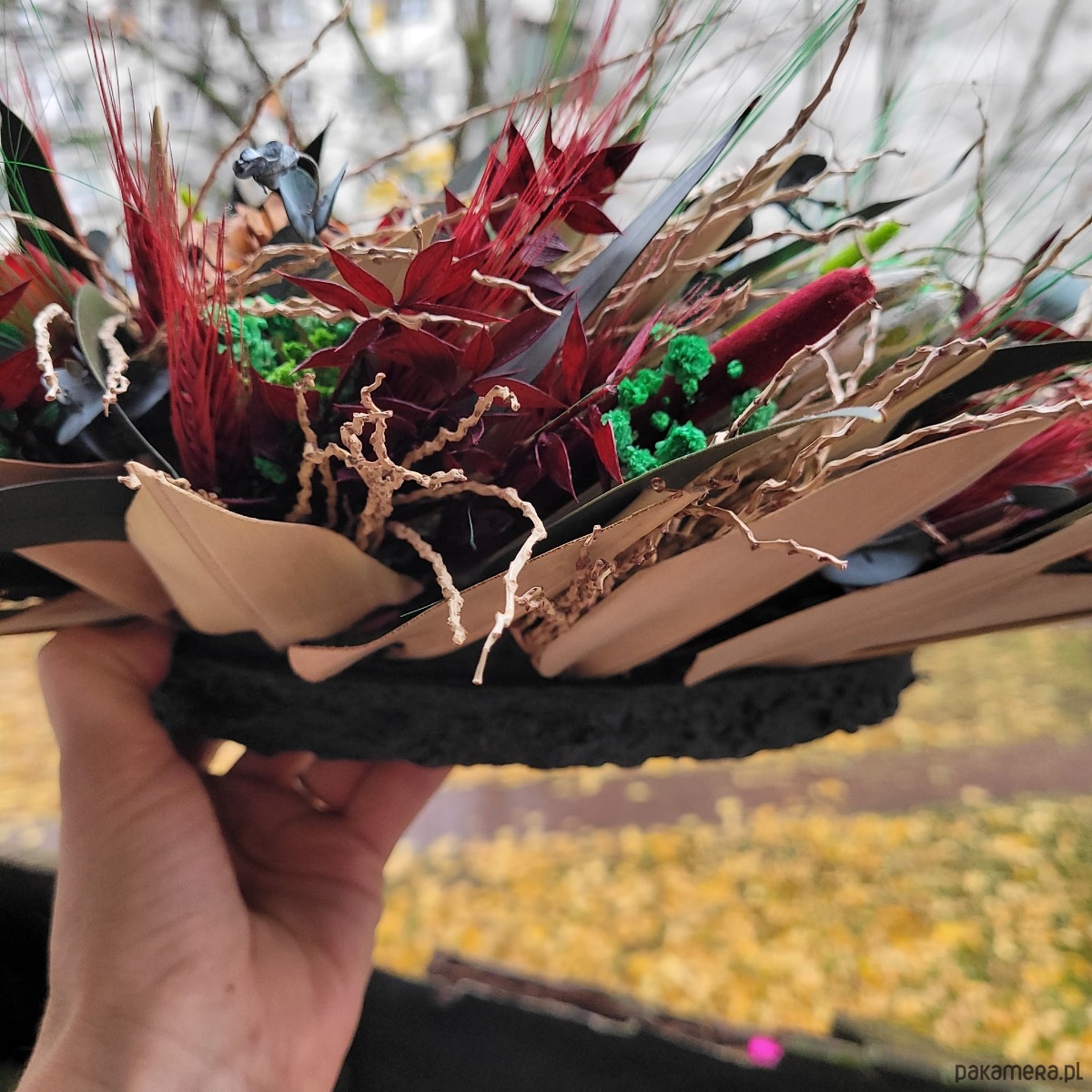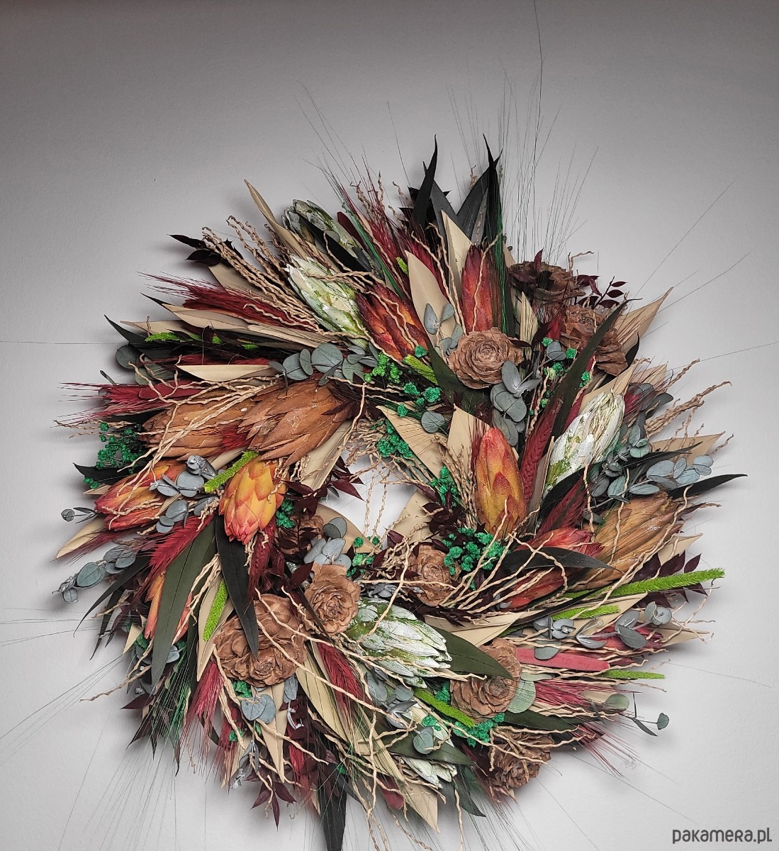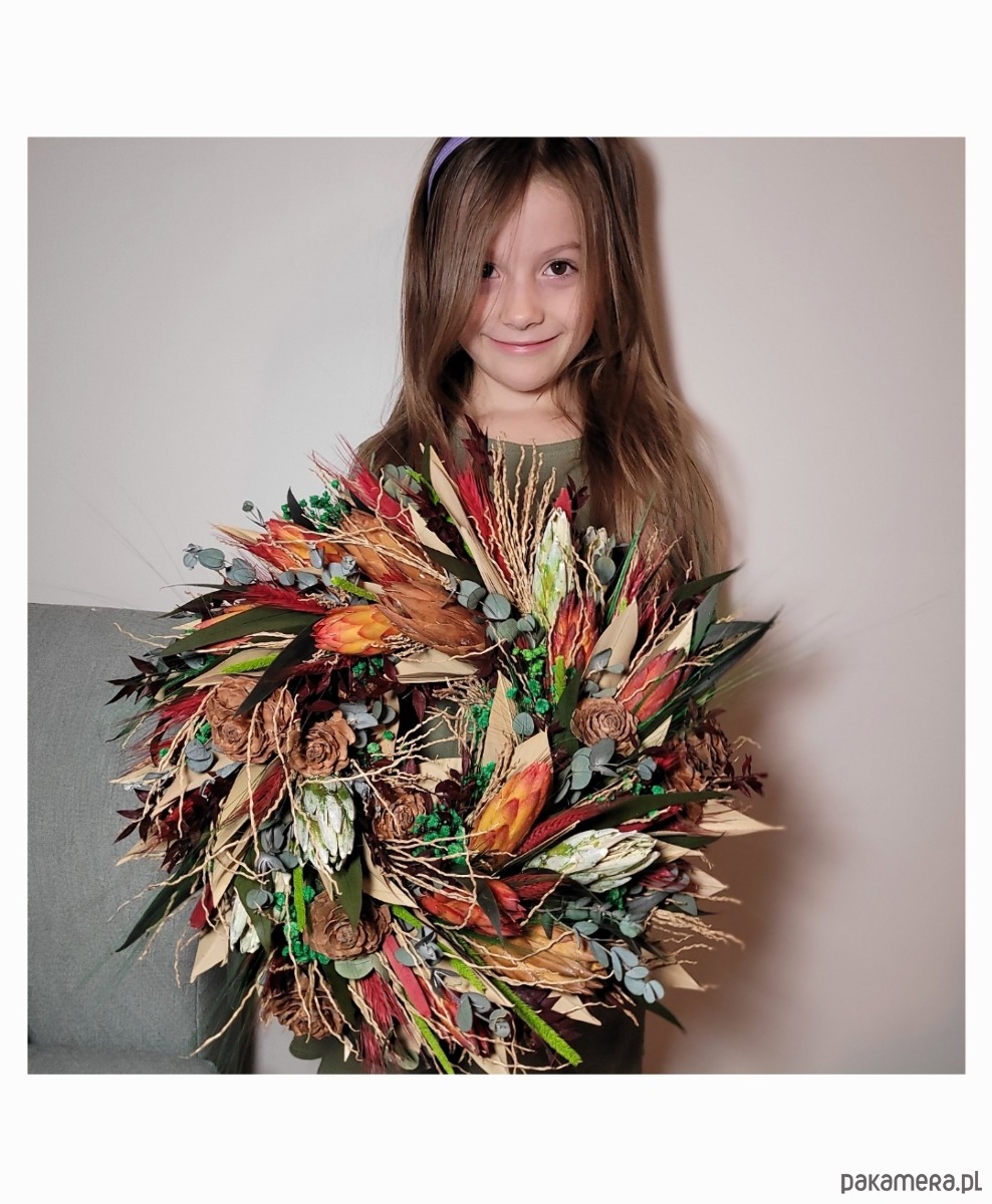 Ten niepowtarzalny wieniec został wykonany z naturalnych, starannie suszonych kwiatów i roślin. Każdy element – od barwnych pąków po delikatne gałązki – został ułożony ręcznie, aby oddać harmonię natury i świąteczny nastrój.