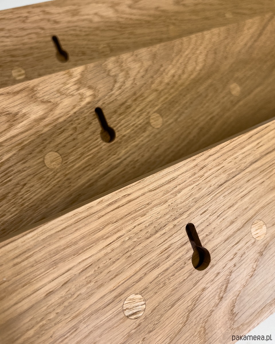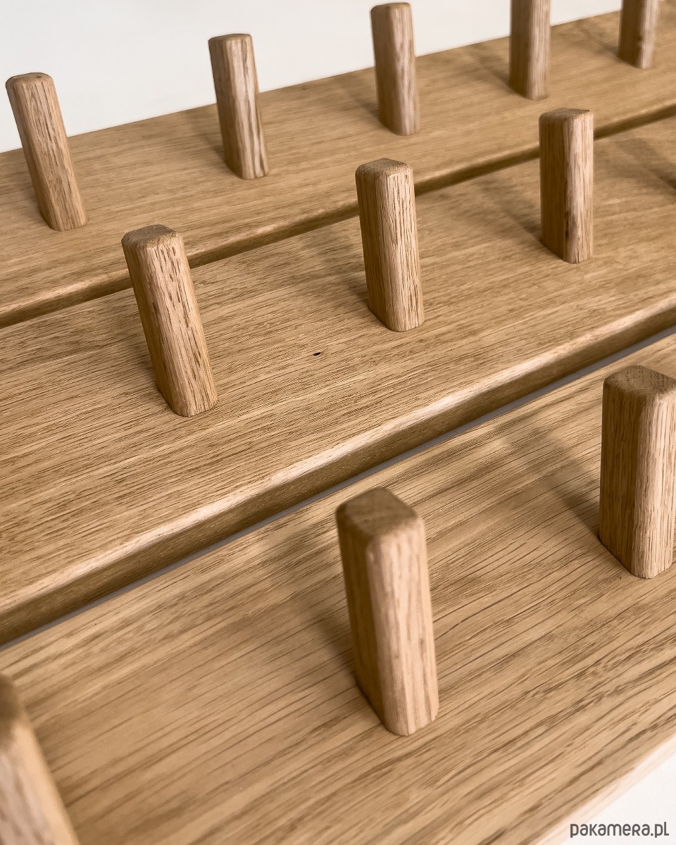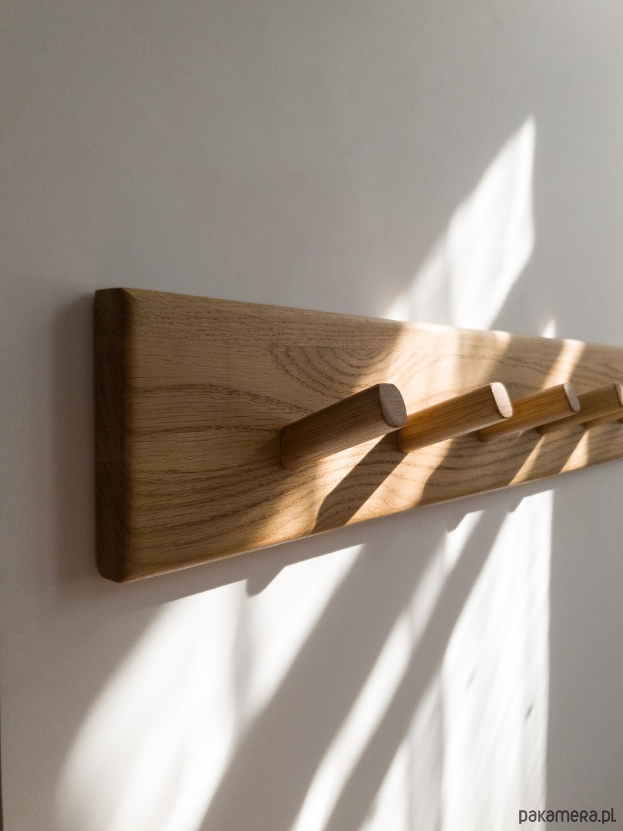 Idealnie sprawdzi się w małym jak i większym wnętrzu. Jeśli lubisz minimalistyczne a zarazem solidne detale to ten wieszak jest tym czego szukasz. Z tyłu posiada uchwyt do zawieszenia na ścianie. Zabezpieczony olejem twardym. Wykonany z drewna dębowego.