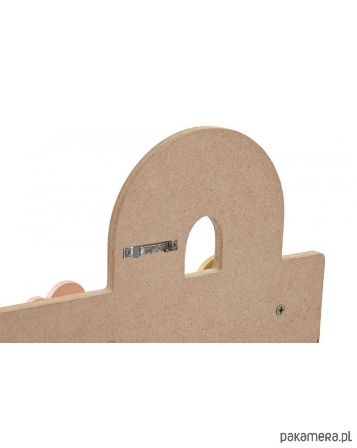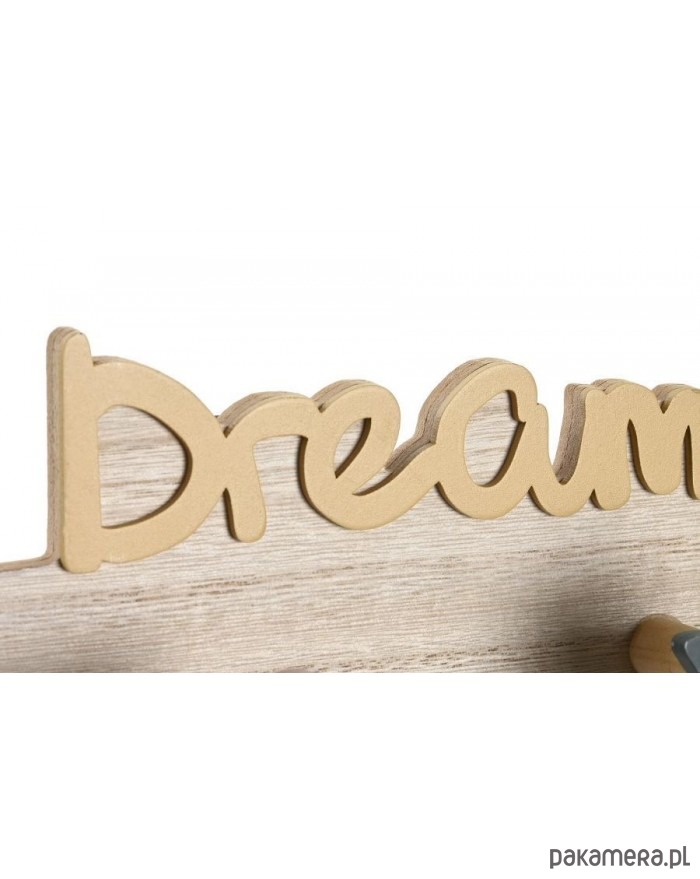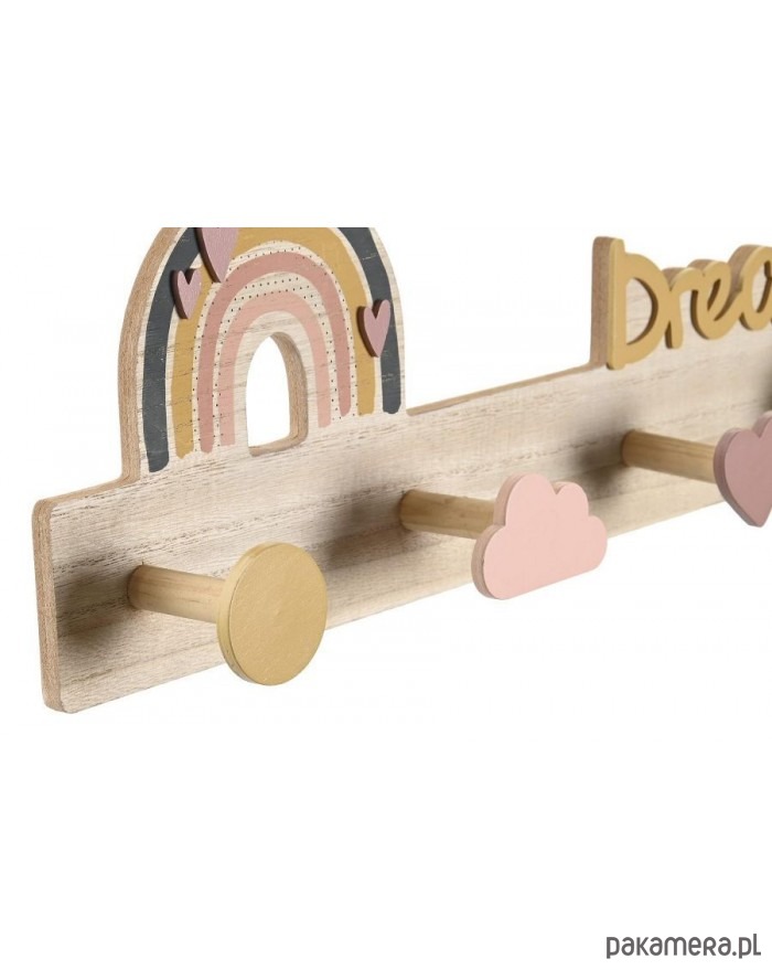 Uroczy wieszak na dziecięce ubranka. Wykonany z MDFu w kolorze brązowym. Zamiast haczyków są umieszczone 4 kołeczki (serduszko, gwiazdka, chmurka, kółko). Nad nimi rozpościera się tęcza i napis DREAM.