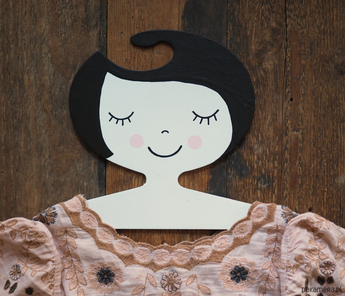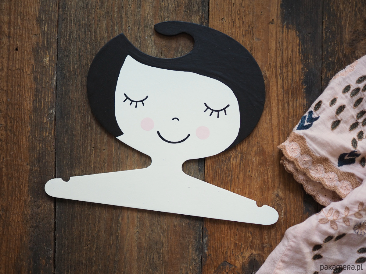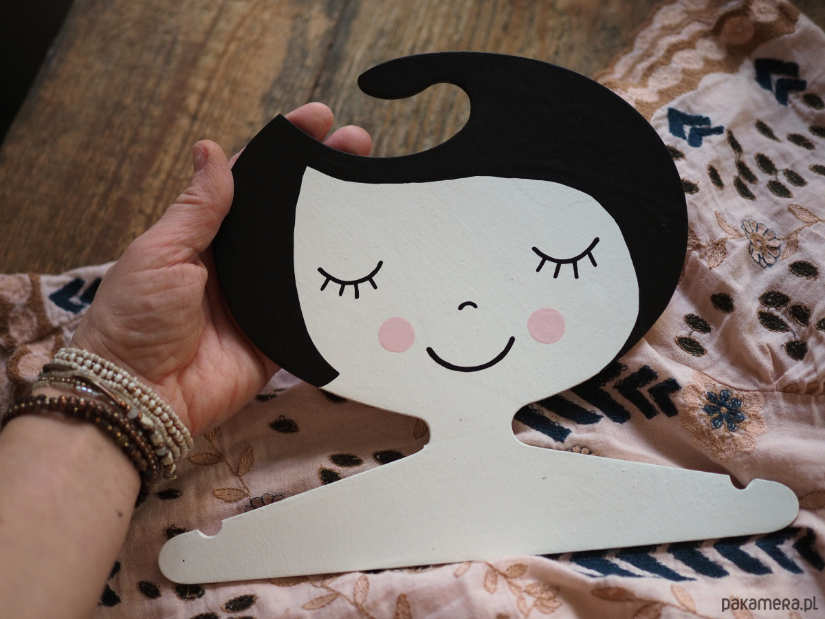 Drewniany, ręcznie malowany, wieszaczek na dziecięce ubranka. Wieszak jest wycięty z drewnianej sklejki i ręcznie malowany przeze mnie wysokiej jakości, wodoodpornymi farbami akrylowymi. Może stanowić uroczy akcent pokoju dziecięcego. Wzór znajduje się z jednej strony, z drugiej pomalowany jest na biało.