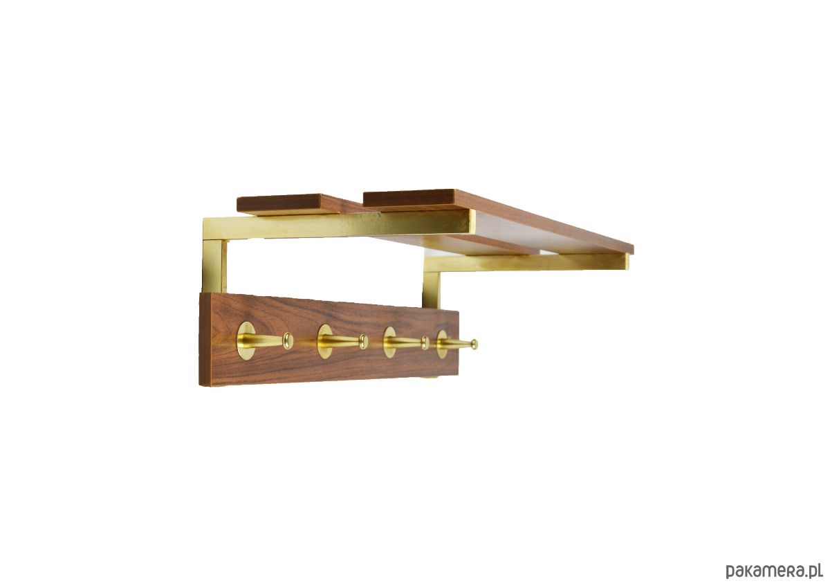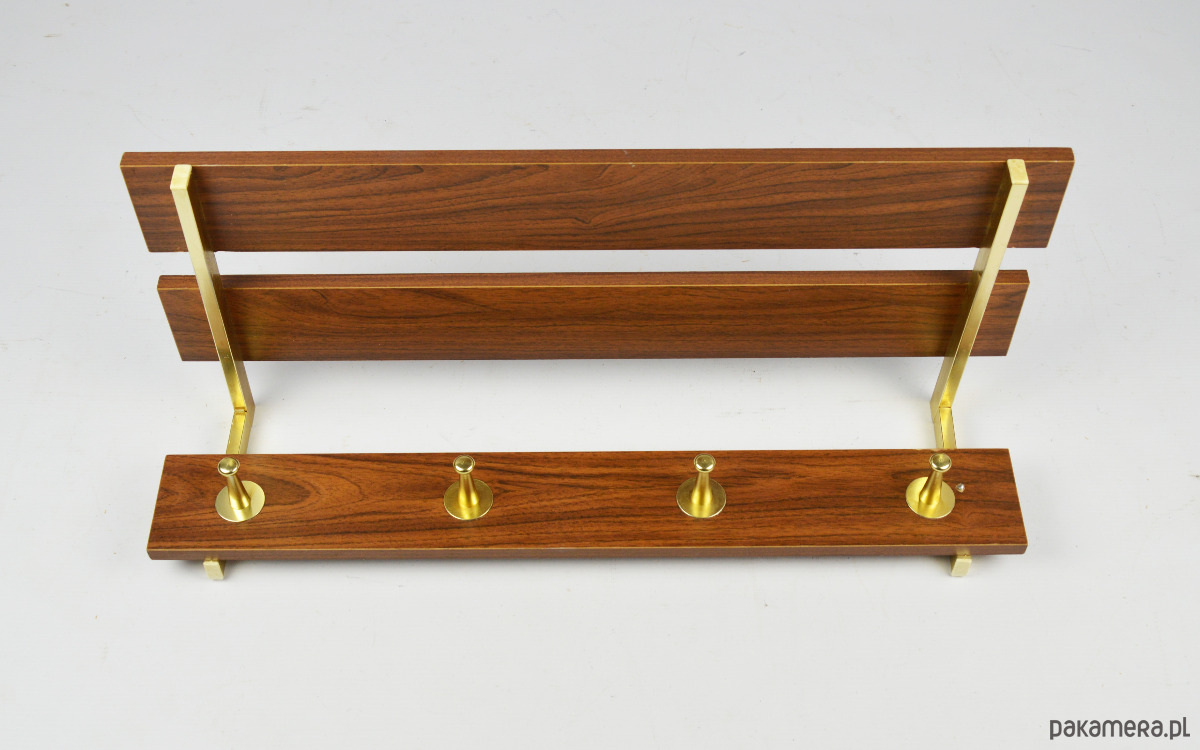 Wieszak / garderoba do przedpokoju z lat 70. Posiada cztery złote zawiesia oraz półkę na czapki. Stan zachowania bardzo dobry, widoczne minmalne ślady użytkowania jak drobne rysy i przetarcia.