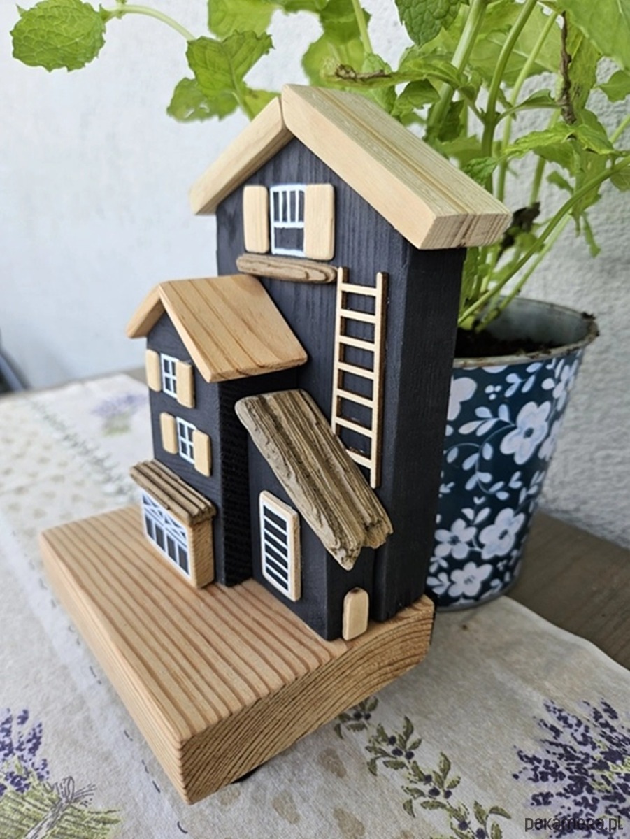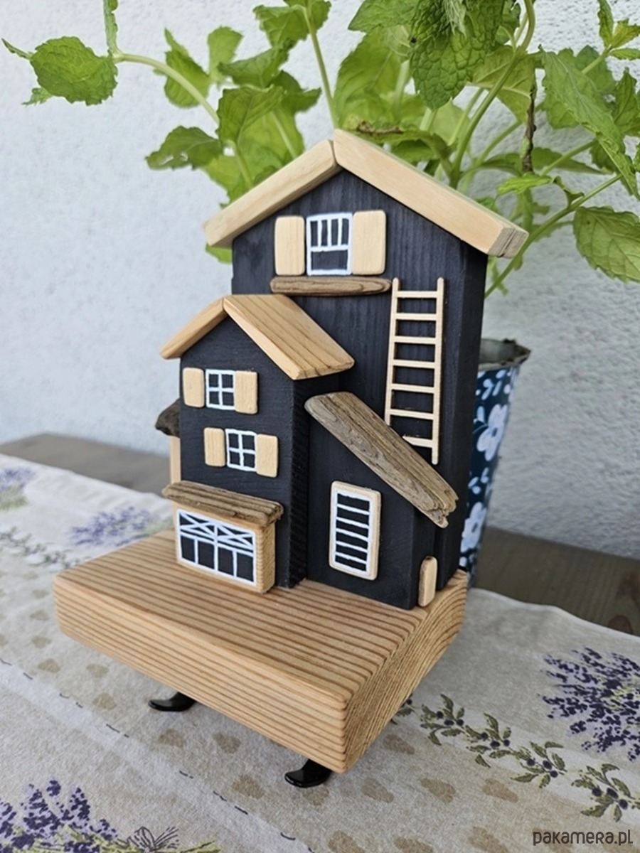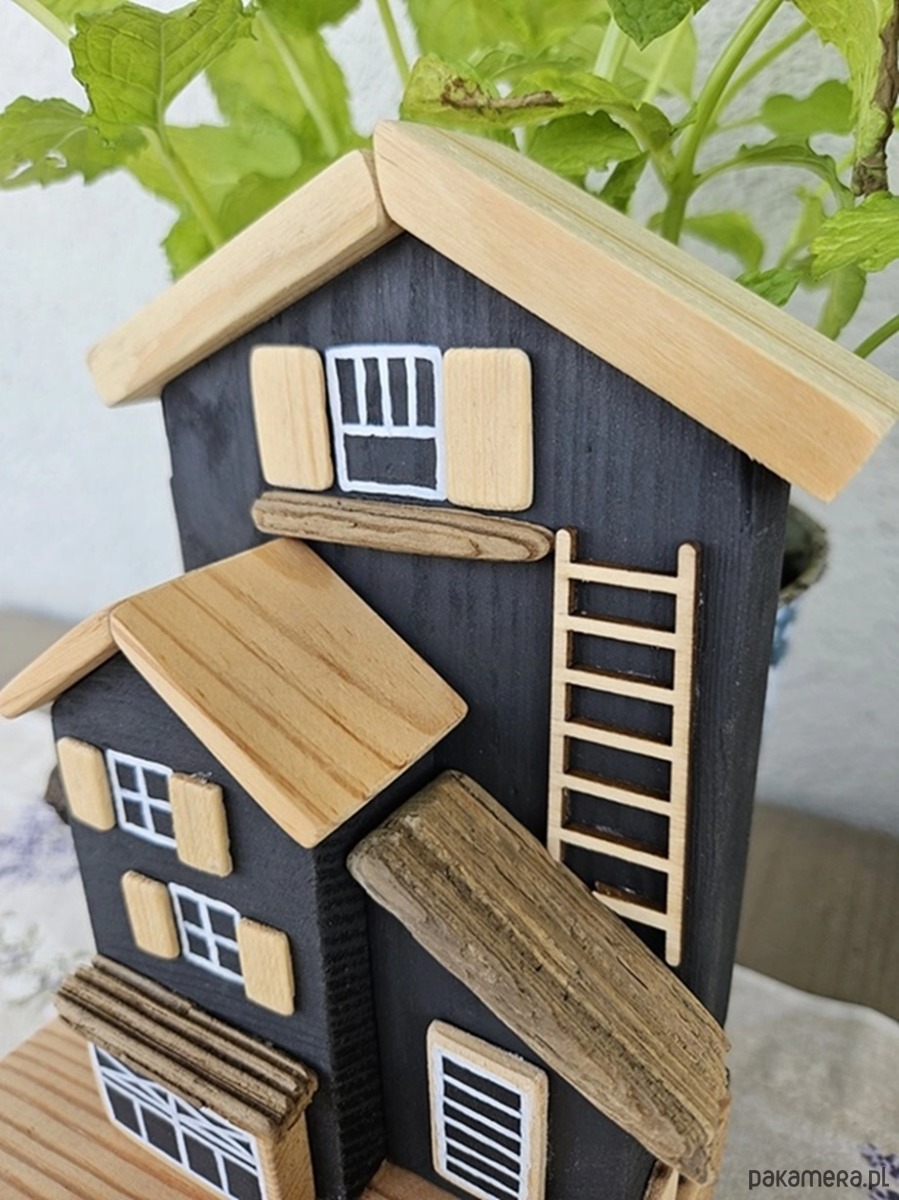 Unikalny design: Urocze drewniane domki tworzą niepowtarzalny klimat, który idealnie wpasuje się w każdy wystrój – od rustykalnego po nowoczesny. Połączenie kolorów czarnego i naturalnego drewna idealnie wpisuje się w klimaty boho.