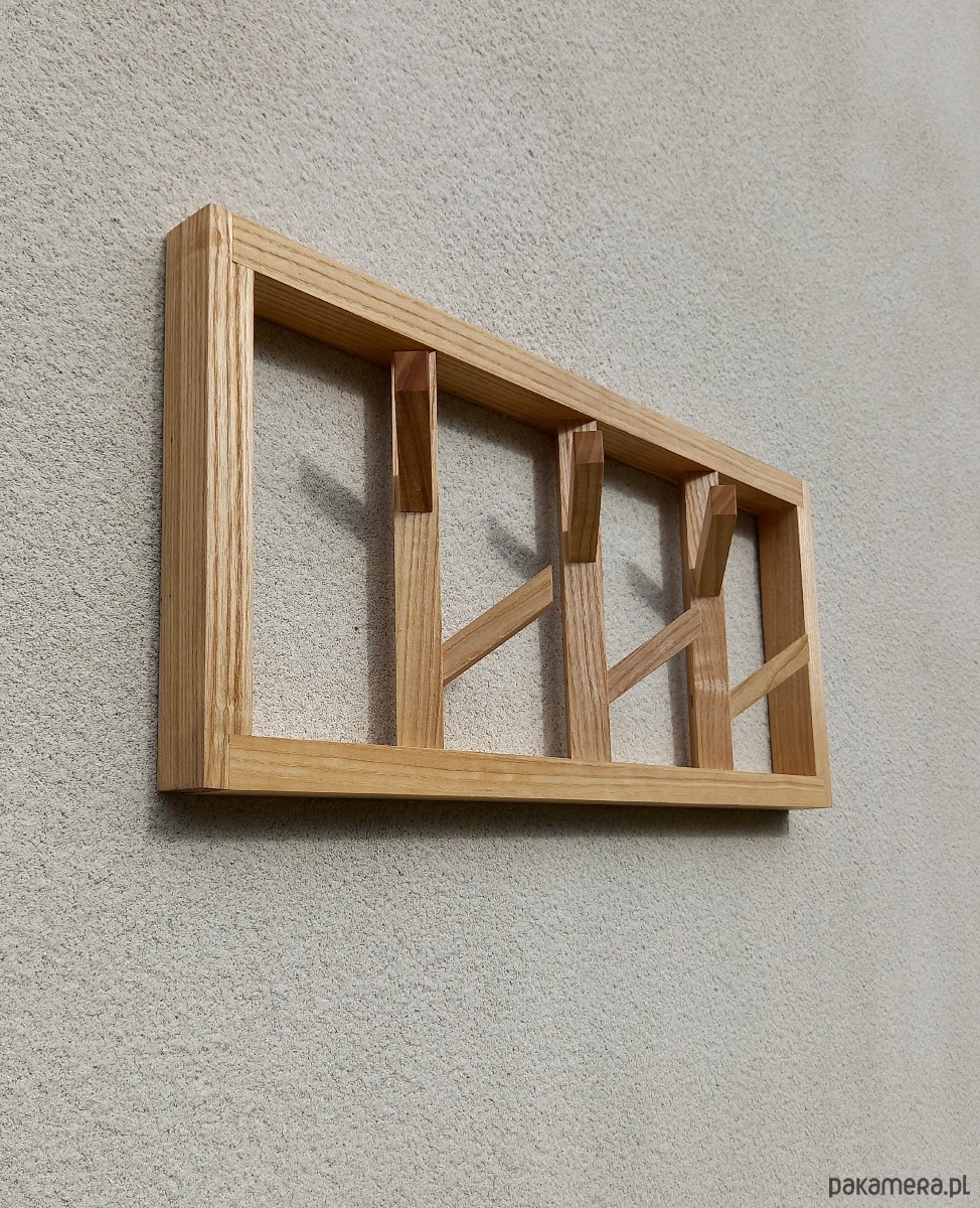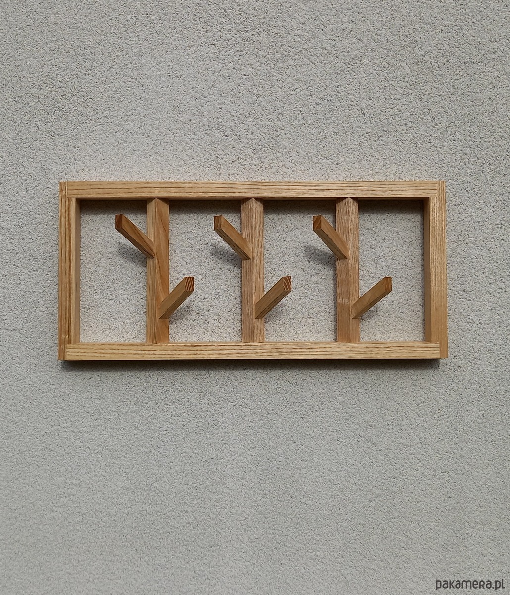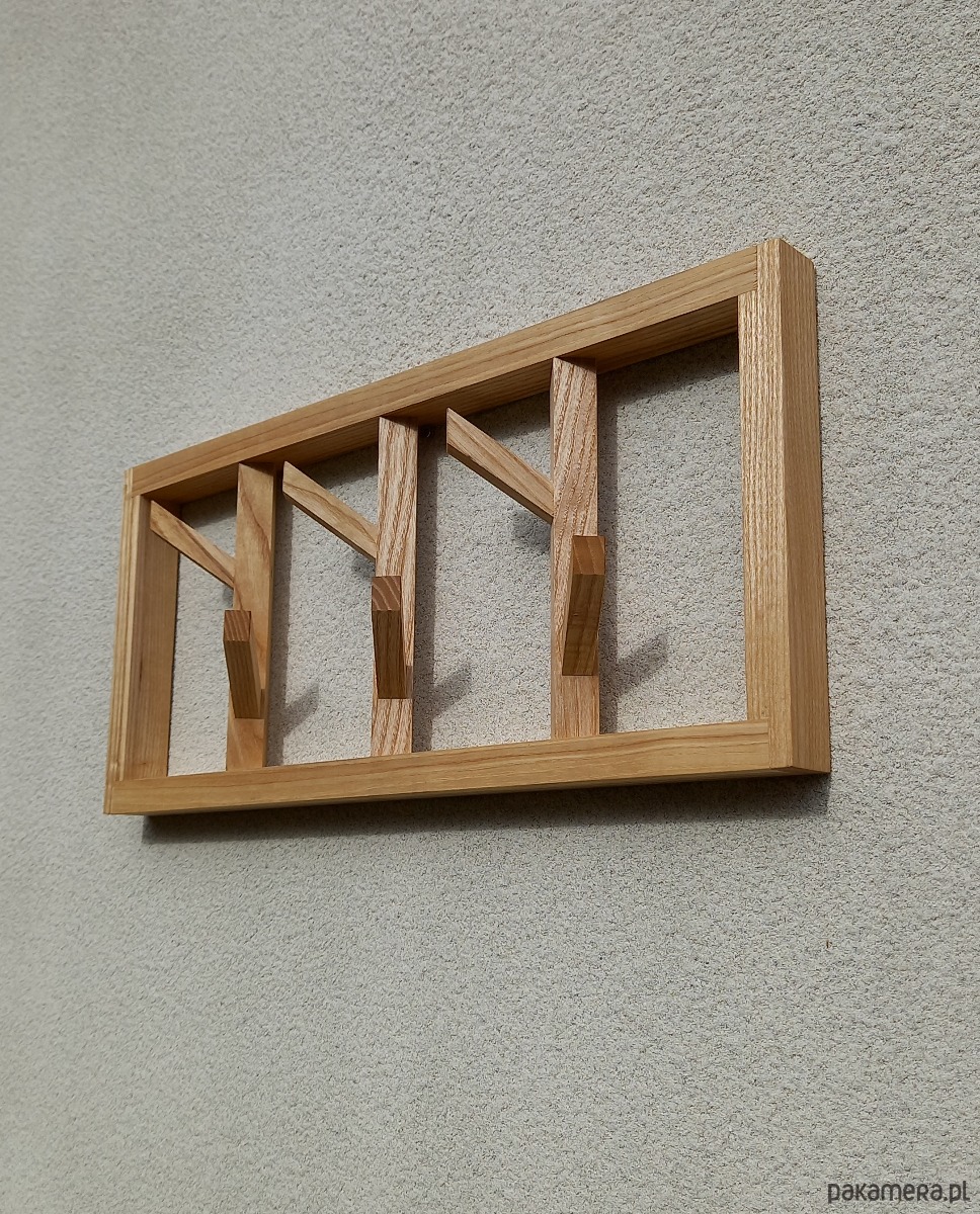 Wieszak naścienny z litego drewna jesionowego wyposażony w sześć solidnych haczyków, które wytrzymają ciężar mokrych płaszczy i toreb z zakupami. Wieszak ma zamontowane z tyłu stalowe zawieszki, które pozwalają ukryć haczyki lub śruby w grubości pionowych belek. Wieszak jest pokryty olejem stolarskim, który go doskonale konserwuje i tworzy matową, aksamitną fakturę, podkreślającą naturę drewna dębowego. Wymiary wieszaka: szerokość 48 cm. , wysokość 22 cm. , głębokość 6,5 cm.