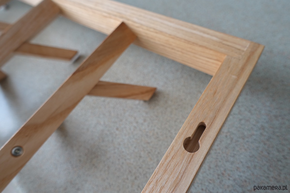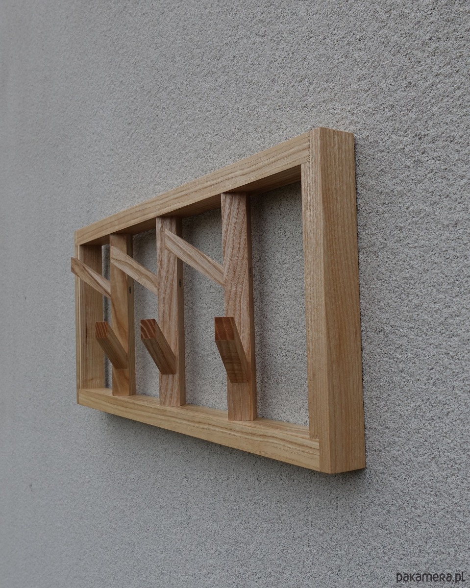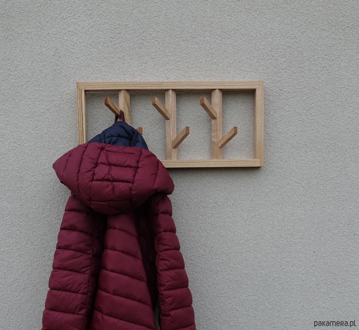 Wieszak naścienny z litego drewna jesionowego wyposażony w sześć solidnych haczyków, które wytrzymają ciężar mokrych płaszczy i toreb z zakupami. Wieszak ma zamontowane z tyłu stalowe zawieszki, które pozwalają ukryć haczyki lub śruby w grubości pionowych belek. Wieszak jest pokryty olejem stolarskim, który go doskonale konserwuje i tworzy matową, aksamitną fakturę, podkreślającą naturę drewna dębowego. Wymiary wieszaka: szerokość 48 cm. , wysokość 22 cm. , głębokość 6,5 cm.