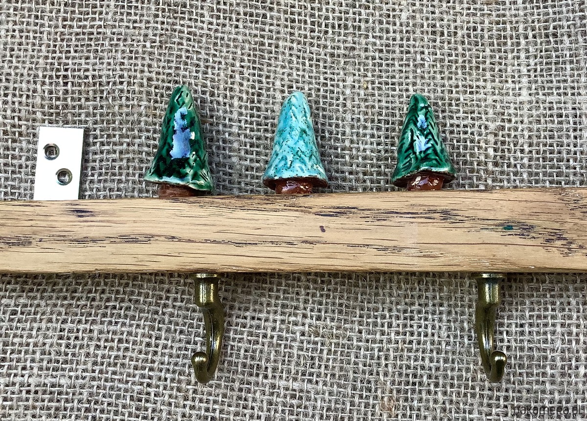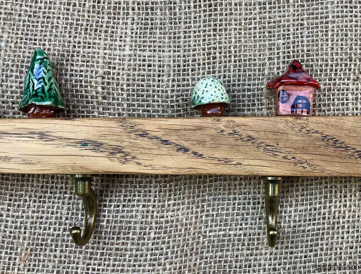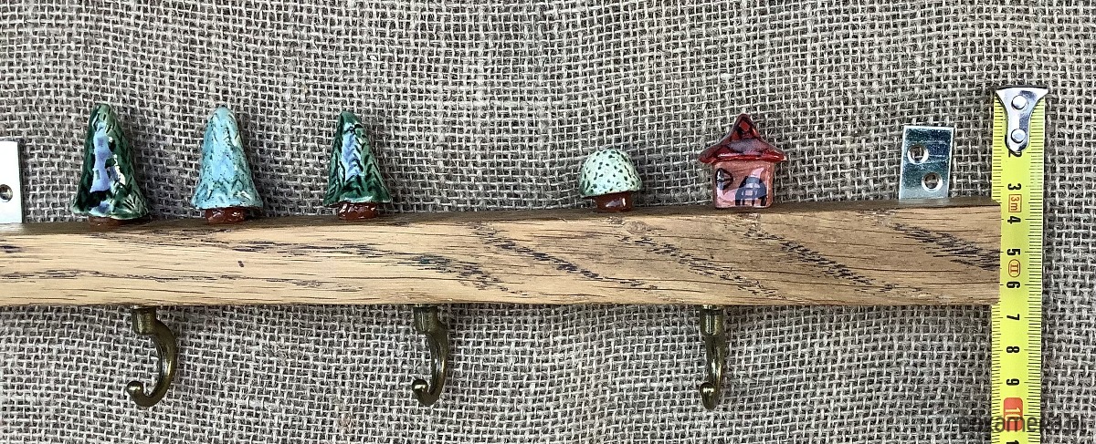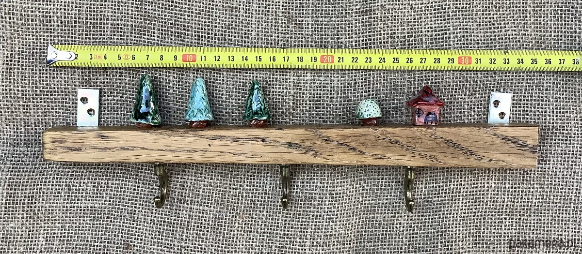 Wieszak wykonany z resztek starego drewna meblowego, które zostało przeczyszczone i zaolejowane. Wieszak ozdobiony domkiem ceramicznym i drzewkami. Zostały one ulepione ręcznie z gliny, poszkliwione i wypalone. Następnie przykleiłam je do drewna. W drewnie umieściłam 3 wieszaczki i z tyłu przywieszki, które umożliwiają zamontowanie go przy pomocy wkrętów.