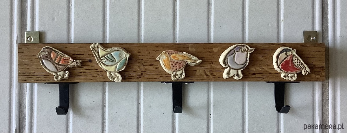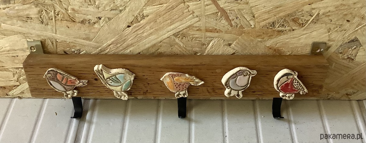 Wieszak wykonany z resztek starego drewna meblowego, które zostało przeczyszczone i zaolejowane. Wieszak ozdobiony ptaszkami. Zostały one odbite w glinie, poszkliwione i wypalone. Następnie przykleiłam je do drewna. W drewnie umieściłam 3 wieszaczki i z tyłu przywieszki, które umożliwiają zamontowanie go przy pomocy wkrętów.