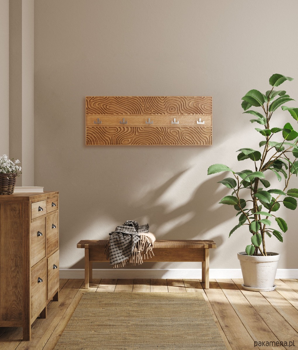 Wieszak ścienny navdesign został wykonany w 100% z naturalnego, litego drewna. Ciepła, naturalna kolorystyka wprowadza unikalny nastrój do nowoczesnych przestrzeni. Proces wykończenia - ręcznie szlifowane i olejowane, wydobywa naturalne piękno i szlachetność drewna.
