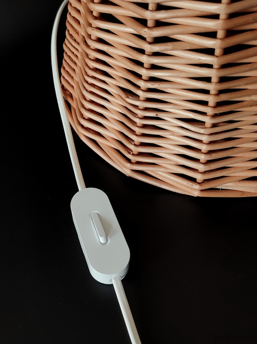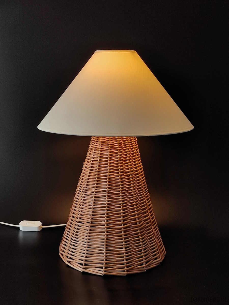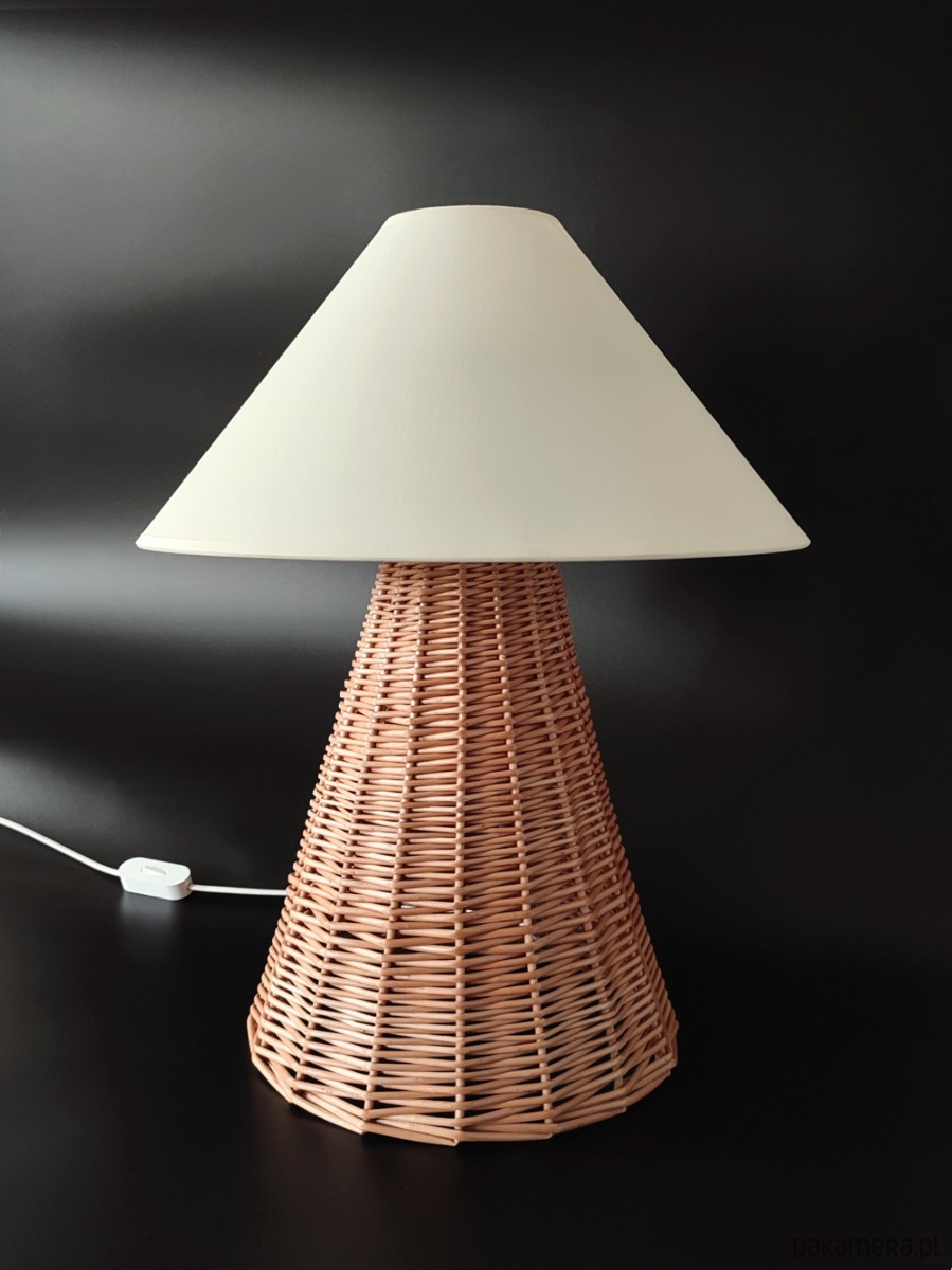 Lampa stołowa z wiklinową podstawą.