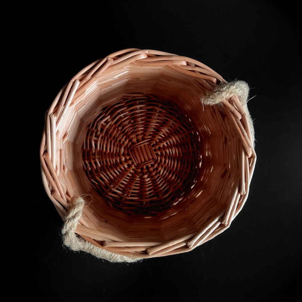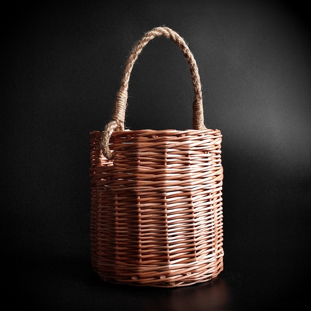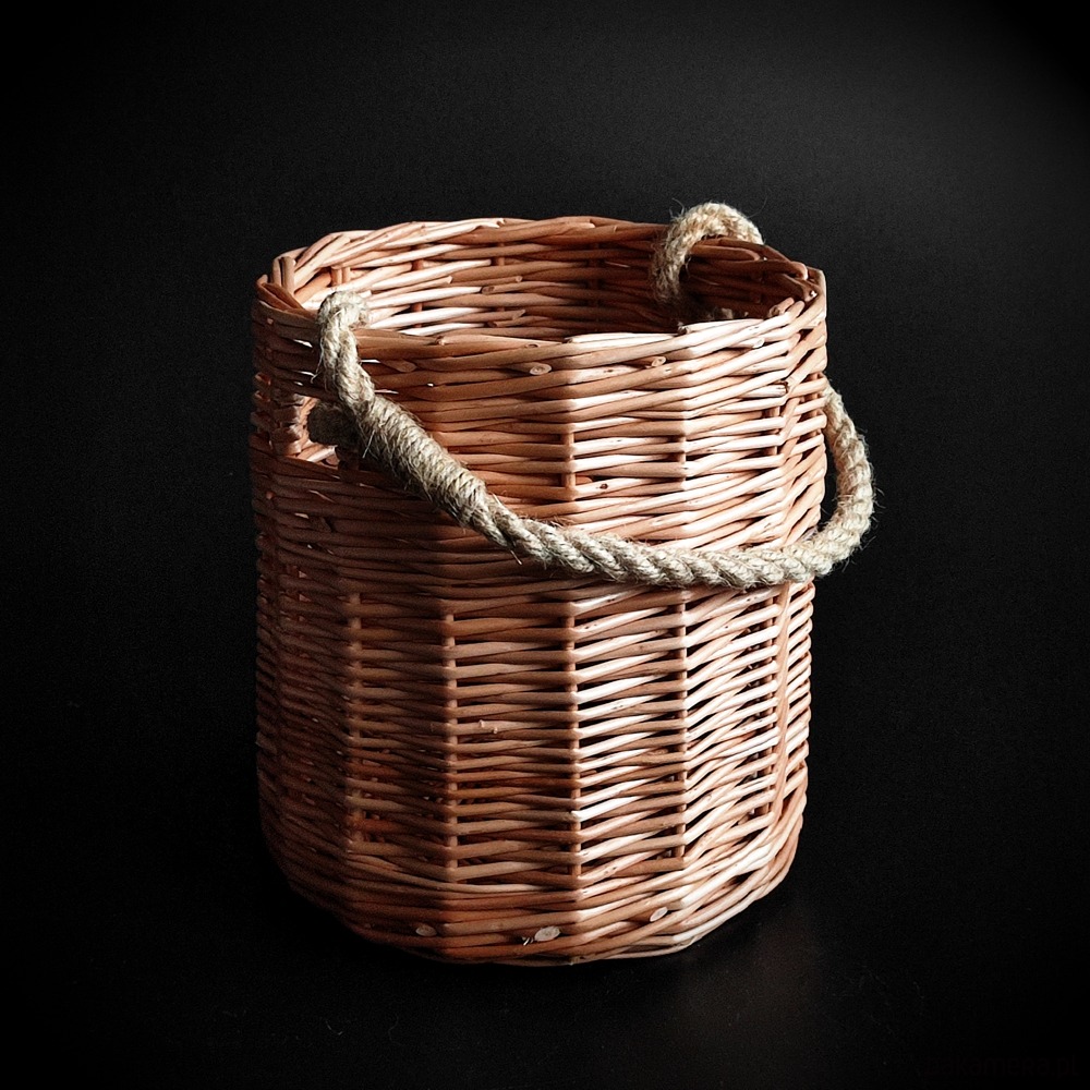 Wiklinowy koszyk z uchwytem z jutowej liny, stylizowany na wiaderko.